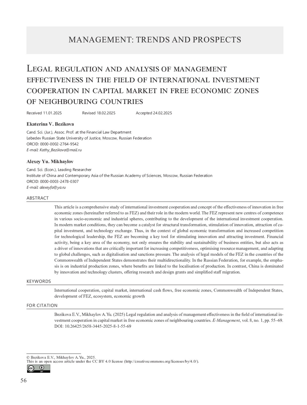 Эта работа представляет собой комплексное исследование международного инвестиционного сотрудничества и концепции эффективности инноваций на рынке капитала в свободных экономических зонах (далее – СЭЗ) и их роли в современном мире. СЭЗ являются новыми центрами компетенций в различных социально-экономических и производственных сферах, способствуя развитию международного инвестиционного сотрудничества. В условиях современных рыночных отношений они могут стать катализатором структурных преобразований, стимулируя инновации, привлечение капиталовложений и обмен технологиями. Так, в условиях глобальной экономической трансформации и усиления конкуренции за технологическое лидерство СЭЗ становятся ключевым инструментом стимулирования инноваций и привлечения инвестиций. Финансовая деятельность, являясь ключевой сферой экономики, не только обеспечивает стабильность и устойчивость хозяйствующих субъектов, но и выступает драйвером инноваций, которые критически важны для повышения конкурентоспособности, оптимизации ресурсного управления и адаптации к глобальным вызовам, таким как цифровизация и санкционное давление. Анализ правовых моделей СЭЗ в странах Содружества Независимых Государств демонстрирует их разнонаправленность. В Российской Федерации, например, акцент сделан на промышленно-производственных зонах, где льготы увязаны с локализацией производств. В Китае, напротив, доминируют инновационно-технологические кластеры, предлагающие гранты на научно-исследовательские и опытно-конструкторские работы и упрощенную миграцию кадров.