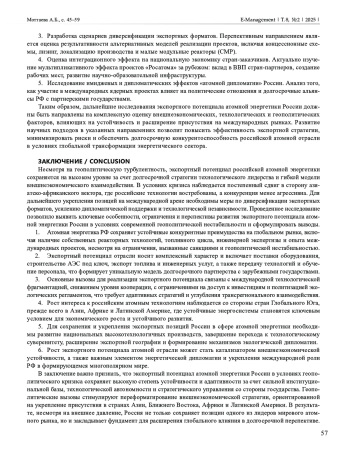 В последние десятилетия российская атомная промышленность активно осваивает внешние рынки, предлагая конкурентоспособные технологии, инфраструктурные решения и топливные услуги. В этом контексте целями исследования являются комплексное обоснование и практическая оценка экспортного потенциала атомной энергетики Российской Федерации (далее – РФ, Россия) в условиях усиления геополитического кризиса с учетом трансформации международной энергетической архитектуры, ограничений санкционного характера и изменения моделей глобального сотрудничества в ядерной сфере. Актуальность исследования заключается в том, что в условиях нарастающего геополитического напряжения атомная энергетика, являясь одним из наиболее наукоемких и высокотехнологичных сегментов отечественной экономики, обладает уникальным экспортным потенциалом, который проявляется не только в строительстве атомных электростанций (далее – АЭС) за рубежом, но и в поставках технологий, топлива, сервисов и компетенций. Тема охватывает стратегически важную задачу – определение роли и потенциала атомной энергетики как инструмента внешнеэкономической политики России и источника укрепления национального технологического суверенитета. Исследование направлено на оценку текущего состояния экспортных возможностей РФ в области строительства АЭС за рубежом, поставок ядерного топлива, технологий и инженерных решений, а также на разработку стратегических направлений устойчивого развития отрасли в условиях ограниченного доступа к западным рынкам и необходимости переориентации на партнерство с государствами Азии, Ближнего Востока, Африки и Латинской Америки.