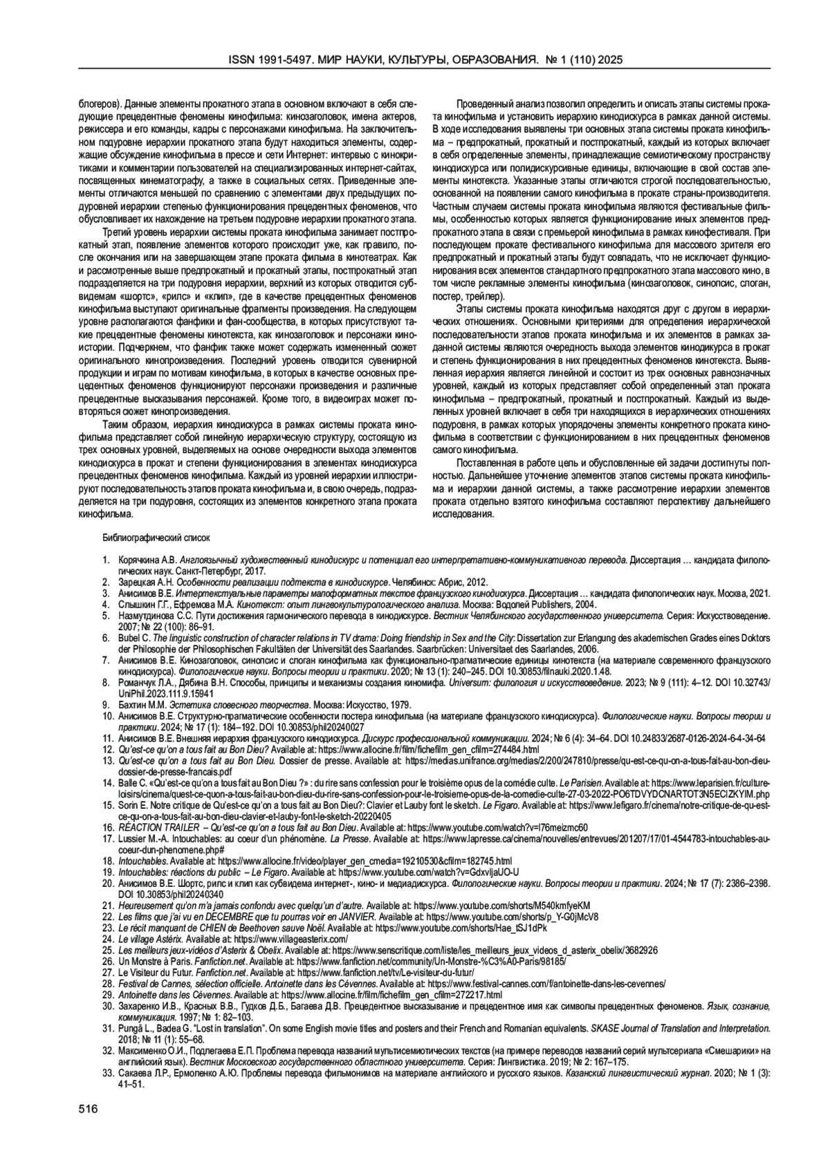 АНИСИМОВ В. Е. ИЕРАРХИЯ КИНОДИСКУРСА В РАМКАХ СИСТЕМЫ ПРОКАТА КИНОФИЛЬМА (НА МАТЕРИАЛЕ ФРАНЦУЗСКОГО КИНОДИСКУРСА) // МИР НАУКИ, КУЛЬТУРЫ, ОБРАЗОВАНИЯ. 2025. № 1 (110)