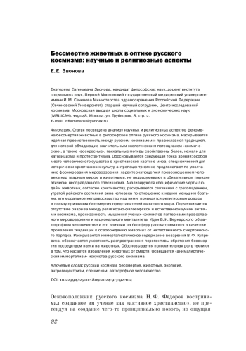 Статья посвящена анализу научных и религиозных аспектов феномена бессмертия животных в философской оптике русского космизма. Раскрывается идейная преемственность между русским космизмом и православной традицией, для которой обладающие значительным экологическим потенциалом «космические», а также «воскресные», пасхальные мотивы свойственны более, нежели для католицизма и протестантизма. Обосновывается следующая точка зрения: особое место человеческого существа в христианской картине мира, специфический для исторически христианских культур антропоцентризм не предполагают по умолчанию формирования мировоззрения, характеризующегося превозношением человека над тварным миром и животными, не подразумевают в обязательном порядке этически неоправданного спесишизма. Анализируются специфические черты людей и животных, согласно христианству, раскрывается связанная с грехопадением, утратой райского состояния вина человека по отношению к нашим меньшим братьям, его моральное непревосходство над ними, приводятся религиозные доводы в пользу признания бессмертия представителей животного мира. Подчеркивается отсутствие разрыва между религиозно-философской и естественнонаучной ветвями космизма, пронизанность мышления ученых-космистов паттернами православного мировоззрения и национального менталитета. Идеи В. И. Вернадского об автотрофном человечестве и его влиянии на биосферу рассматриваются в качестве проявления тенденции к освобождению животных от «естественного» смертоносного порядка. Раскрывается имморталистическое содержание воззрений В. Ф. Купревича, обозначается уместность распространения перспективы обретения бессмертия посредством науки на животных. Обосновывается положительная роль техники в том, что касается избавления животных от смерти. Освещается «анималистический иммортализм» искусства русского космизма.
