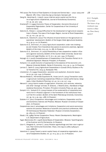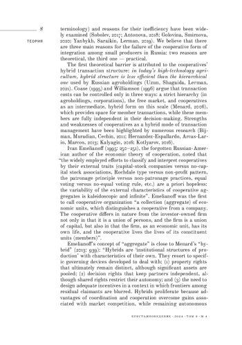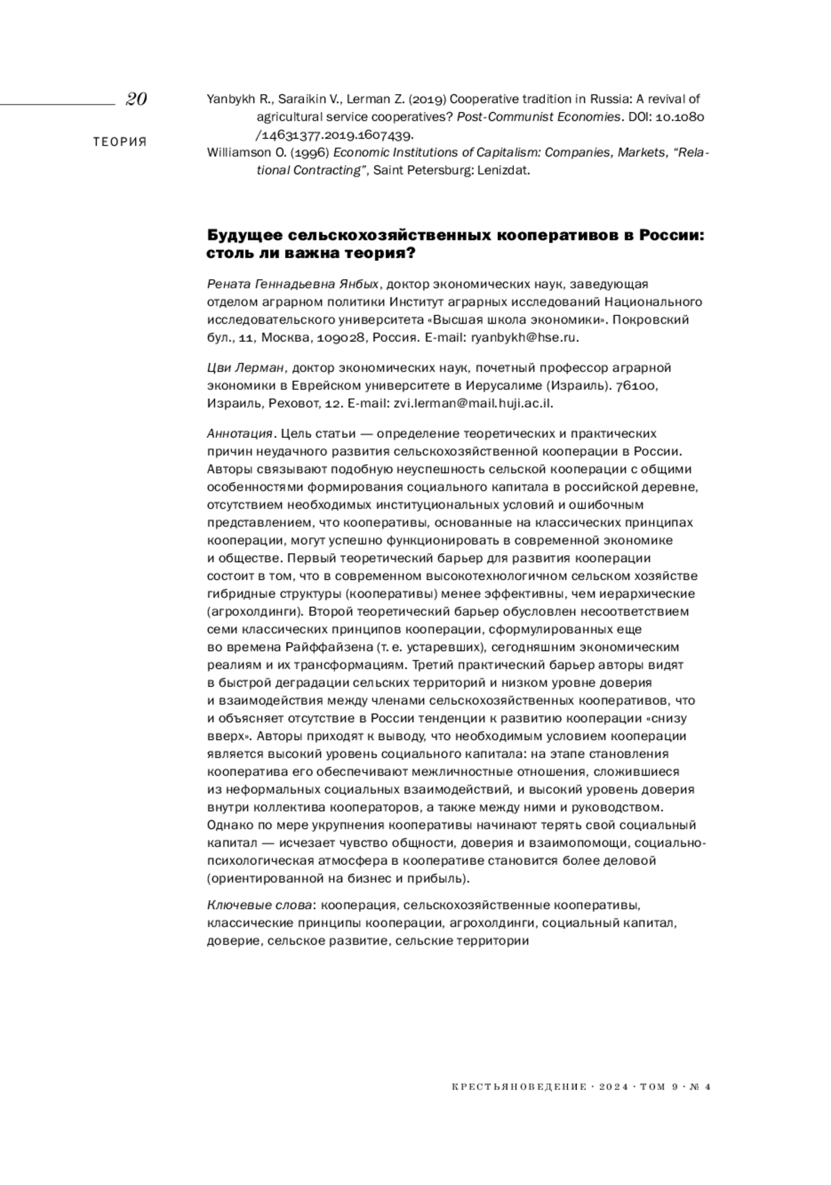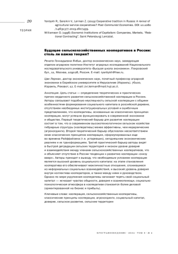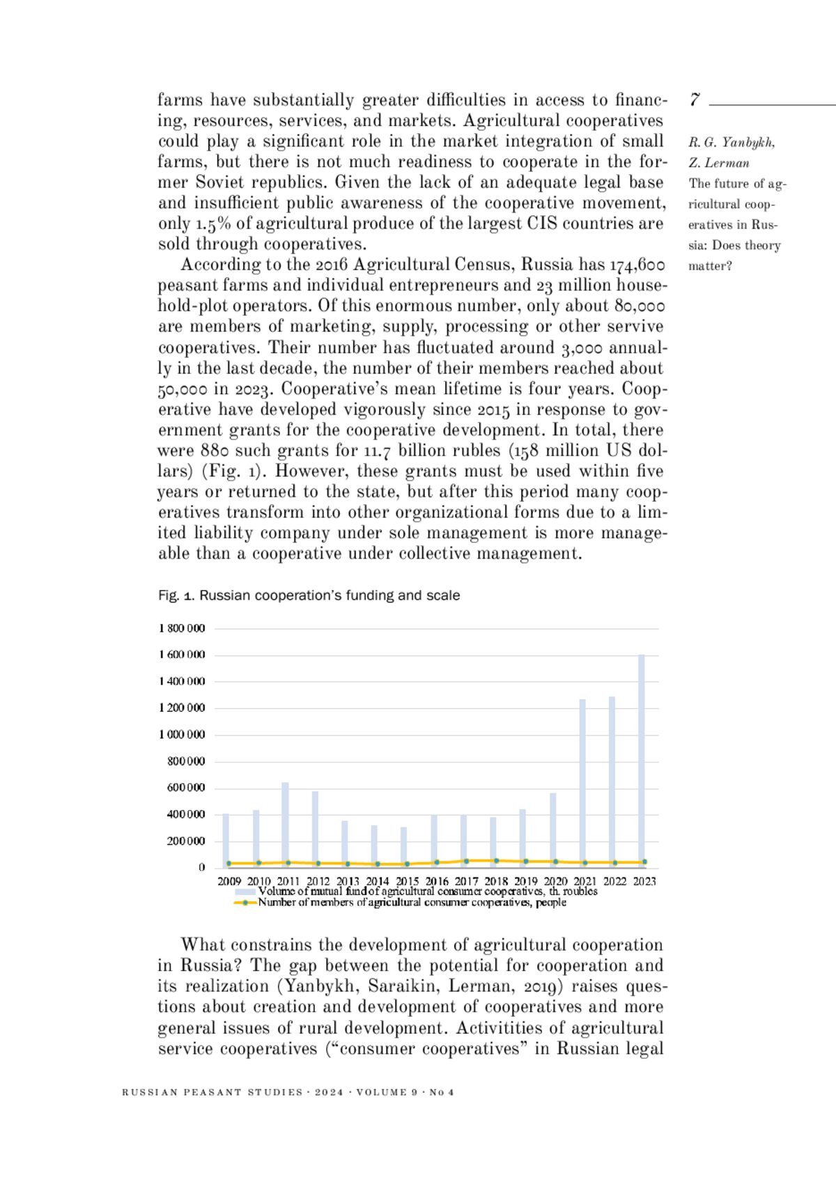 ЯНБЫХ Р. Г., ЛЕРМАН Ц. THE FUTURE OF AGRICULTURAL COOPERATIVES IN RUSSIA: DOES THEORY MATTER? // КРЕСТЬЯНОВЕДЕНИЕ. 2024. Т. 9 № 4