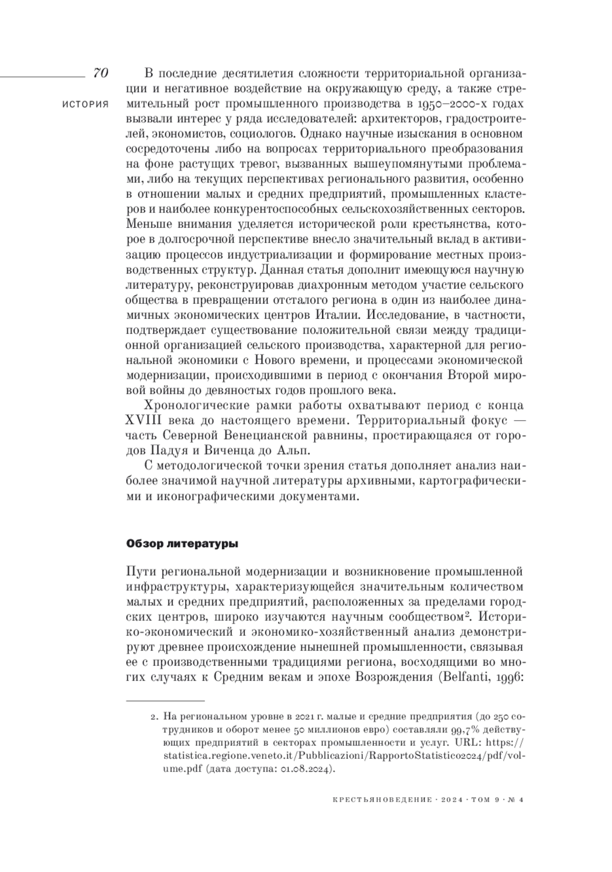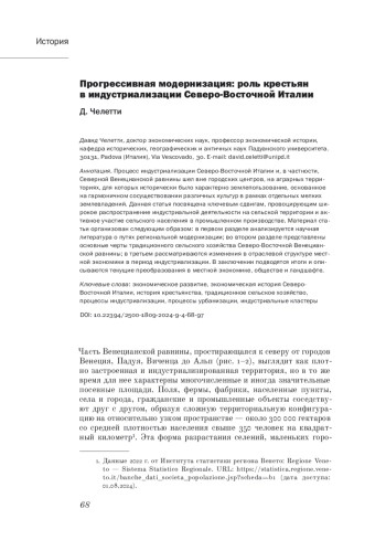 Процесс индустриализации Северо-Восточной Италии и, в частности, Северной Венецианской равнины шел вне городских центров, на аграрных территориях, для которых исторически было характерно землепользование, основанное на гармоничном сосуществовании различных культур в рамках отдельных мелких землевладений. Данная статья посвящена ключевым сдвигам, провоцирующим широкое распространение индустриальной деятельности на сельской территории и активное участие сельского населения в промышленном производстве. Материал статьи организован следующим образом: в первом разделе анализируется научная литература о путях региональной модернизации; во втором разделе представлены основные черты традиционного сельского хозяйства Северо-Восточной Венецианской равнины; в третьем рассматриваются изменения в отраслевой структуре местной экономики в период индустриализации. В заключении подводятся итоги и описываются текущие преобразования в местной экономике, обществе и ландшафте.