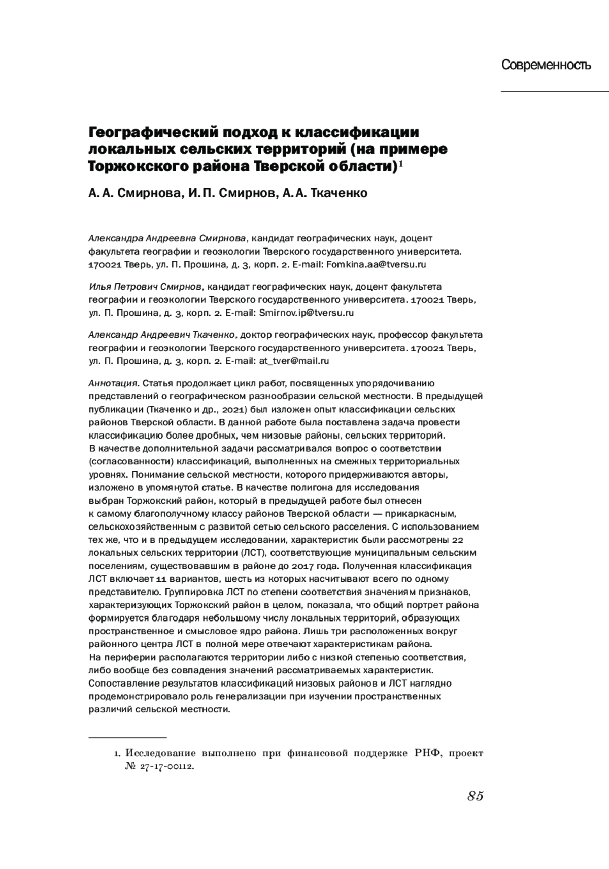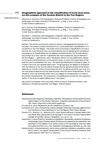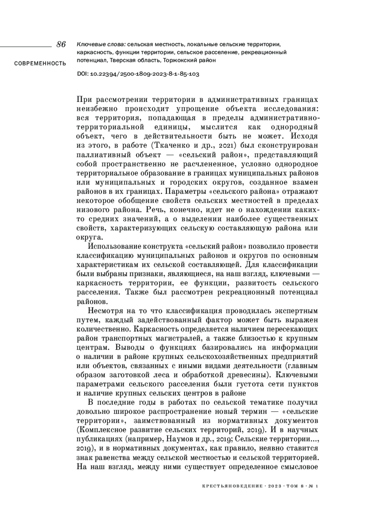 СМИРНОВА А. А., СМИРНОВ И. П., ТКАЧЕНКО А. А. ГЕОГРАФИЧЕСКИЙ ПОДХОД К КЛАССИФИКАЦИИ ЛОКАЛЬНЫХ СЕЛЬСКИХ ТЕРРИТОРИЙ (НА ПРИМЕРЕ ТОРЖОКСКОГО РАЙОНА ТВЕРСКОЙ ОБЛАСТИ) // КРЕСТЬЯНОВЕДЕНИЕ. 2023. Т. 8 № 1