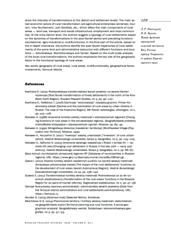 1. Аверкиева К. В. (2021). Постсоветская трансформация лесных поселков на севере Нечерноземья // Крестьяноведение. № 3. С. 90-110. EDN: VIBBYK