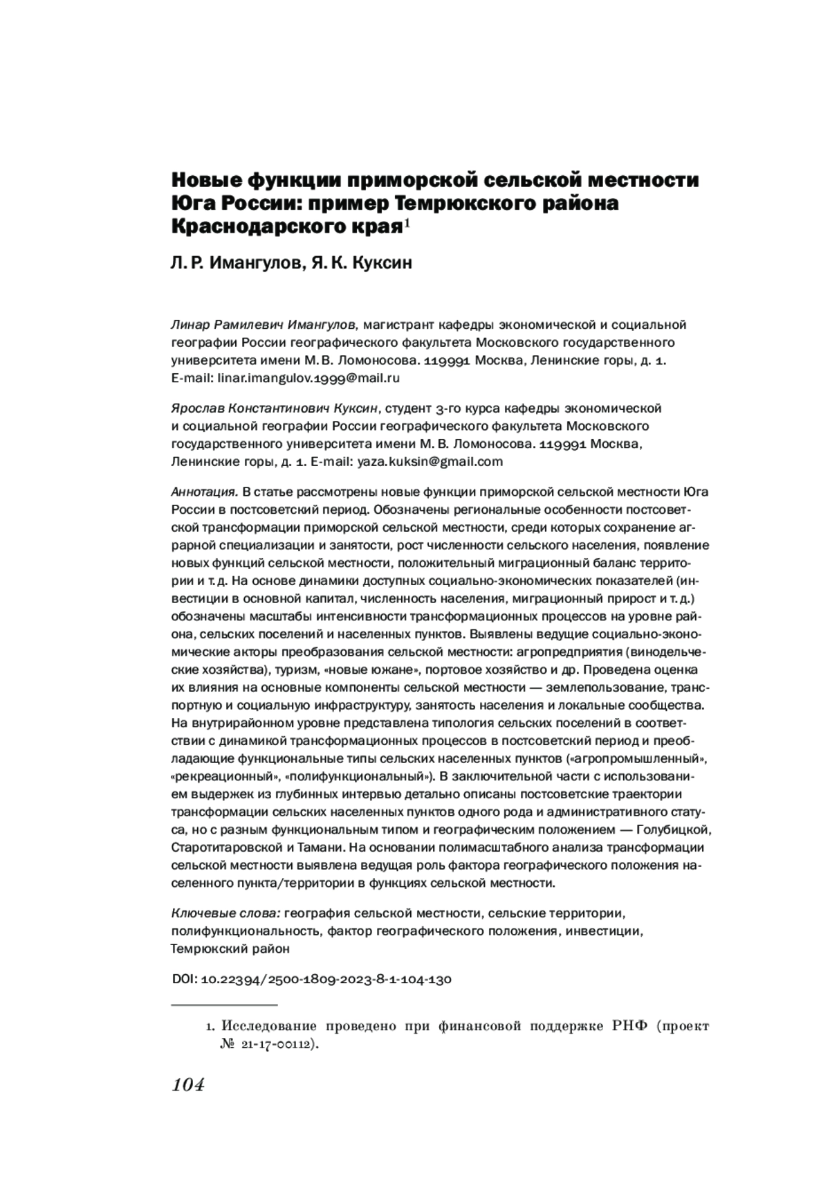В статье рассмотрены новые функции приморской сельской местности Юга России в постсоветский период. Обозначены региональные особенности постсоветской трансформации приморской сельской местности, среди которых сохранение аграрной специализации и занятости, рост численности сельского населения, появление новых функций сельской местности, положительный миграционный баланс территории и т. д. На основе динамики доступных социально-экономических показателей (инвестиции в основной капитал, численность населения, миграционный прирост и т. д.) обозначены масштабы интенсивности трансформационных процессов на уровне района, сельских поселений и населенных пунктов. Выявлены ведущие социально-экономические акторы преобразования сельской местности: агропредприятия (винодельческие хозяйства), туризм, «новые южане», портовое хозяйство и др. Проведена оценка их влияния на основные компоненты сельской местности - землепользование, транспортную и социальную инфраструктуру, занятость населения и локальные сообщества. На внутрирайонном уровне представлена типология сельских поселений в соответствии с динамикой трансформационных процессов в постсоветский период и преобладающие функциональные типы сельских населенных пунктов («агропромышленный», «рекреационный», «полифункциональный»). В заключительной части с использованием выдержек из глубинных интервью детально описаны постсоветские траектории трансформации сельских населенных пунктов одного рода и административного статуса, но с разным функциональным типом и географическим положением - Голубицкой, Старотитаровской и Тамани. На основании полимасштабного анализа трансформации сельской местности выявлена ведущая роль фактора географического положения населенного пункта/территории в функциях сельской местности.