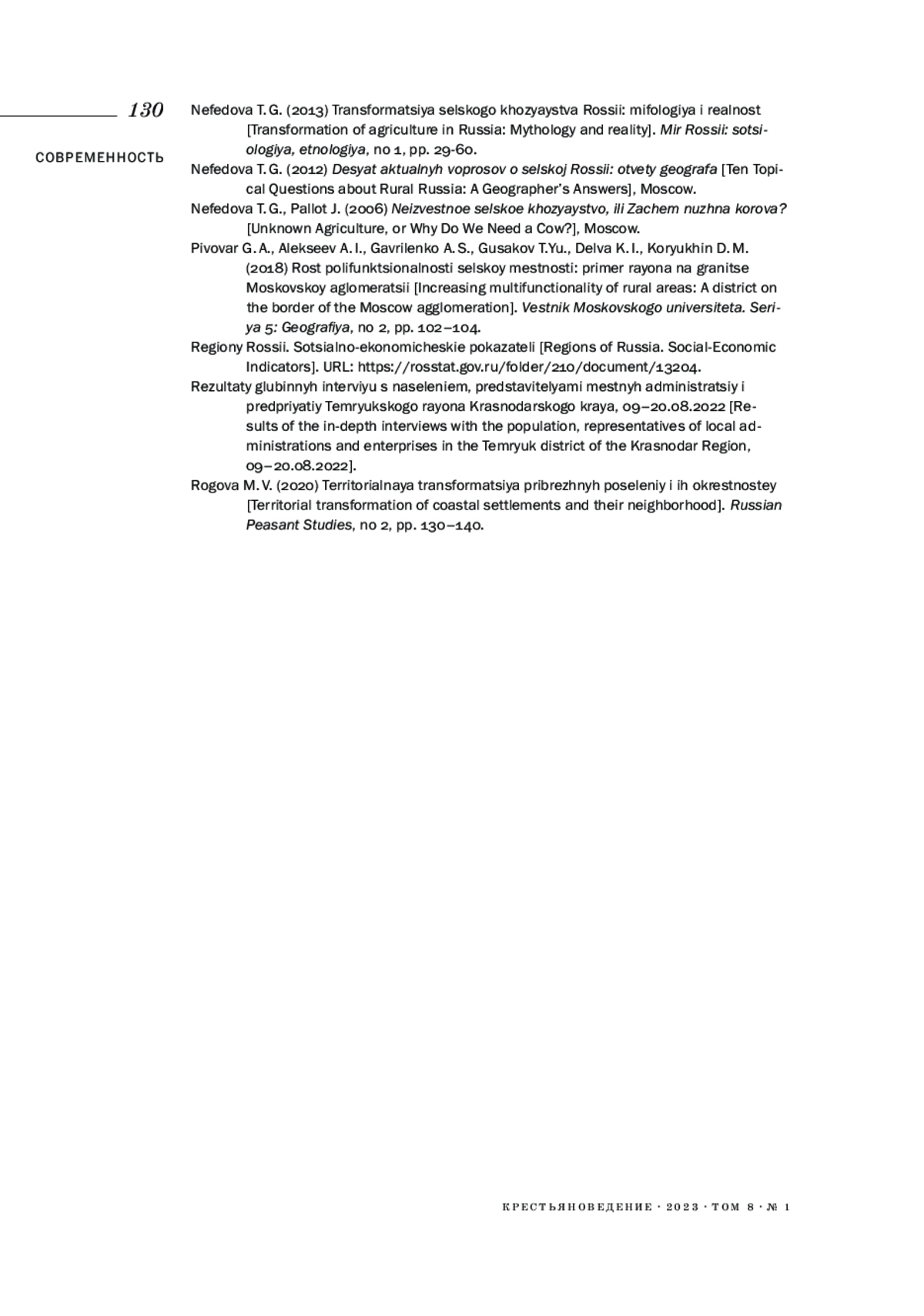 13. Нефедова Т. Г. (2013). Трансформация сельского хозяйства России: мифология и реальность // Мир России. Социология. Этнология. № 1. С. 29-60. EDN: PVKGBV