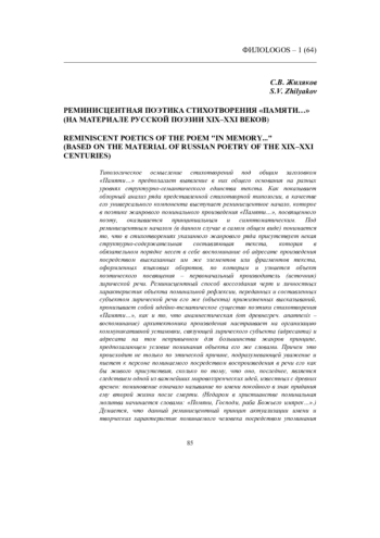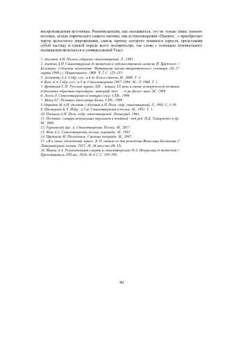 Стихотворение «Памяти…» неоднократно становилось предметом изучения в трудах современных исследователей. Так, Д. Н. Ахапкин весь комплекс лирических текстов с типическими номинативами «Памяти…» и «На смерть…» сводит в отдельную группу «стихотворений in memoriam, которые имеют сходную тематику и структуру и могут быть описаны как отдельное жанровое образование» [2, 123].