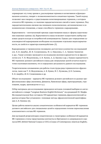 В данной статье рассматриваются варианты фразеологических единиц-терминов делового английского языка для специальных целей. Целью работы явился семантический анализ вариантов фразеотерминов с установлением степени переосмысления компонентного состава. В результате исследования было установлено, что варианты ФЕ-терминов могут демонстрировать как полное, так и частичное переосмысление компонентного состава.