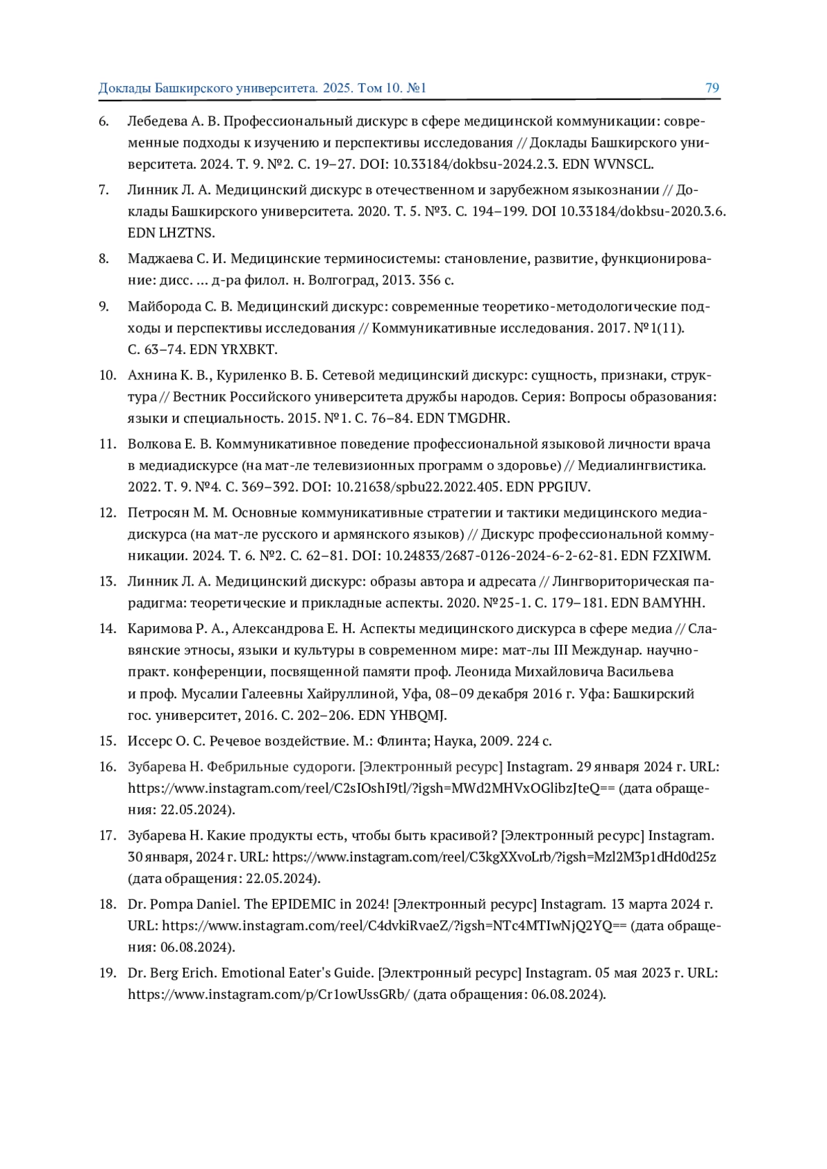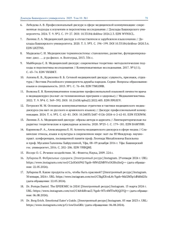 6. Лебедева А. В. Профессиональный дискурс в сфере медицинской коммуникации: современные подходы к изучению и перспективы исследования // Доклады Башкирского университета. 2024. Т. 9. №2. С. 19-27. DOI: 10.33184/dokbsu-2024.2.3 EDN: WVNSCL