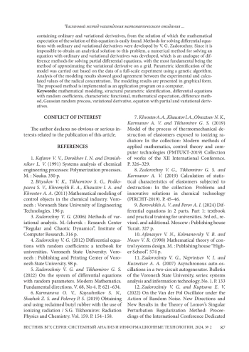 2. Битюков В. К., Тихомиров С. Г., Подкопаева С. В., Хромых Е. А., Хаустов И. А., Хвостов А. А. Математическое моделирование объектов управления в химической промышленности. - Воронеж: Воронежский государственный университет инженерных технологий, 2011. - 196 с. EDN: UUFRMF