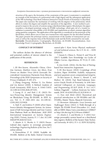 7. Sasson E., Chiesa A., Tromer E., Virza M. Scalable Zero Knowledge via Cycles of Elliptic Curves // Algorithmica. -2017. - № 79 (4). -P. 1102-1160.