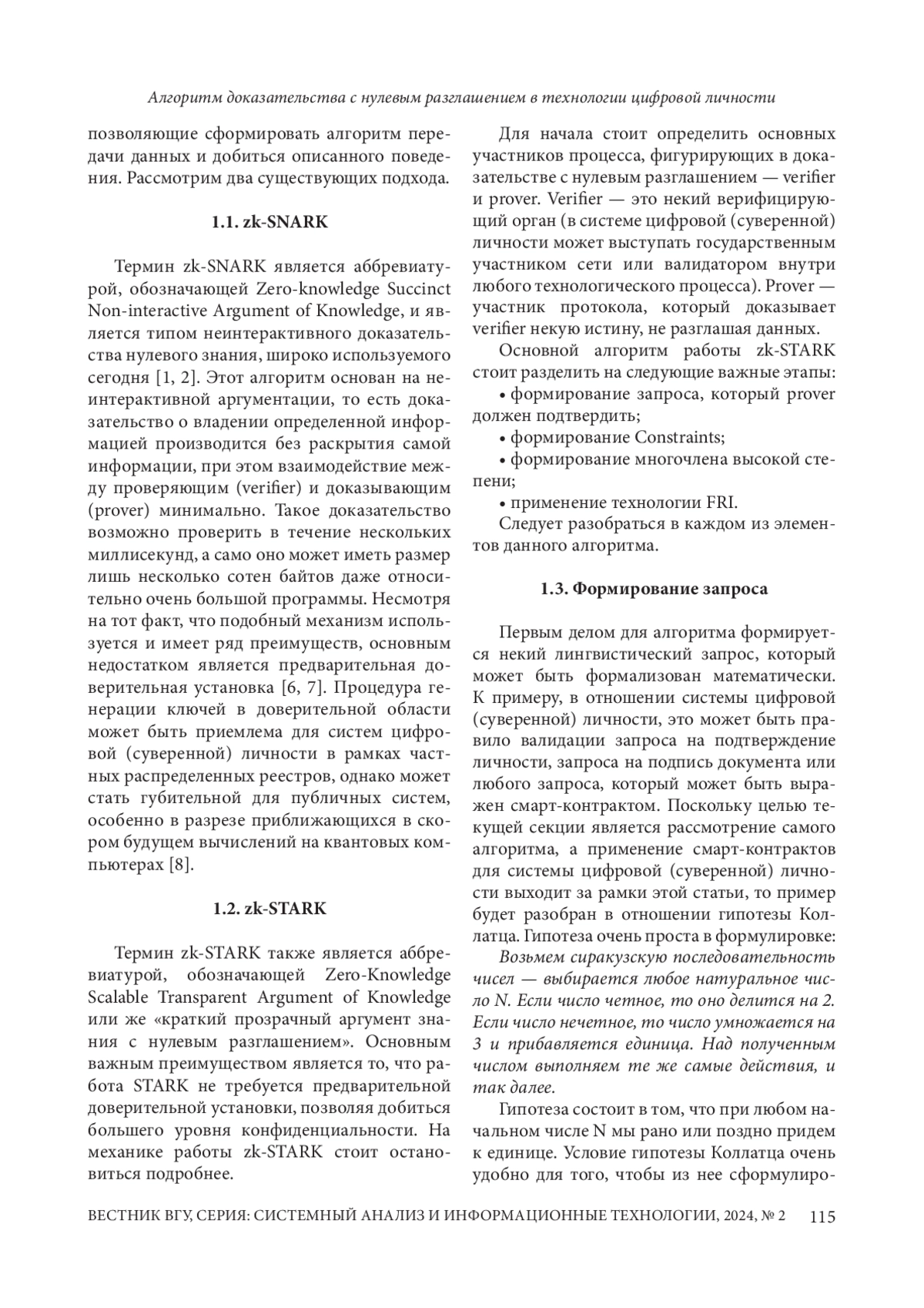 В работе обсуждаются модели и методы реализации криптографических алгоритмов доказательства с нулевым разглашением и рассматриваются различные формы этих алгоритмов, такие как zk-SNARK и zk-STARK. Применение реализации данных алгоритмов обсуждается в рамках построения системы цифровой (суверенной) личности. Также в работе подробно разбирается технология zk-STARK, приводятся последовательные шаги и математические абстракции, которые могут реализовать подобный алгоритм и применить его в конструируемом решении. Реализация алгоритма приводится на примере формулировки гипотезы Коллатца, рассматривается построение запроса, формирование ограничений запроса (constraints), описывается пример формирования полинома с высокой степенью и последующего применения технологии FRI (Fast Reed-Solomon Interactive Oracle Proofs of Proximity). В работе также разбирается механизм работы со степенями полинома, позволяющий снизить степень и упростить работу алгоритма. Предложен новый метод, позволяющий повысить безопасность систем, использующих распределенный реестр данных (блокчейн): в работе рассматривается разработанный прототип, использующий технологию zk-STARK, которая избавляется от доверенной установки (потенциальной уязвимости zk-SNARK) и реализует алгоритм, устойчивый к атакам, с использованием квантовых компьютеров. Применение алгоритма рассматривается на прототипе блокчейна, который позволяет выпускать новые транзакции с поддержкой описанного метода. В работе приведены метрики прототипа, измерение количества транзакций в секунду, а также времени отклика узла блокчейна и потребляемой одним узлом оперативной памяти.