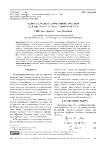 1. Borisenko G. V. A diffusion method for image filtering and sharpening / G. V. Borisenko, A. M. Denisov, A. S. Krylov // Programming and Computer Software. - 2008. - Vol. 34. - № 5. -P. 267-270,. DOI: 10.1134/S0361768808050034 EDN: LLLAZB