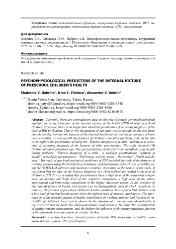 Статья: ПСИХОФИЗИОЛОГИЧЕСКИЕ ПРЕДИКТОРЫ ВНУТРЕННЕЙ КАРТИНЫ ЗДОРОВЬЯ ДОШКОЛЬНИКОВ (2025)