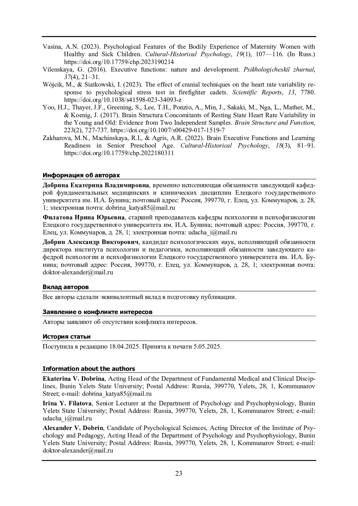 ДОБРИНА Е. В., ФИЛАТОВА И. Ю., ДОБРИН А. В. ПСИХОФИЗИОЛОГИЧЕСКИЕ ПРЕДИКТОРЫ ВНУТРЕННЕЙ КАРТИНЫ ЗДОРОВЬЯ ДОШКОЛЬНИКОВ // ПСИХОЛОГИЯ ОБРАЗОВАНИЯ В ПОЛИКУЛЬТУРНОМ ПРОСТРАНСТВЕ. 2025. № 2 (70)