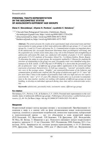 В статье представлены результаты экспериментального исследования личностных черт и их репрезентации в статусных группах в своем коллективе подростков разных возрастных групп 11-12 лет (группа № 1) и 14-15 лет (группа № 2). Общение занимает важное место в жизни подростка, успешное взаимодействие определяет его психологическое благополучие, а обретение определенного социального статуса играет ключевую роль в формировании и укреплении самооценки подростка. Исследование проведено с обучающимися 5-6-х классов (151 ученик) и 8-9-х классов (112 обучающихся) МБОУ СОШ № 3 г. Белая Калитва Ростовской области. Для определения статуса в коллективе сверстников использовался социометрический метод исследования структуры взаимоотношений в группе Дж. Морено. Личностные черты выявлялись при помощи опросников Р. Б. Кеттелла: 12 PF/CPQ и 14 PF/HSPQ. Показано, что профиль личности подростков «звезды» разных возрастных групп значительно отличается по содержанию и высокой выраженности личностных характеристик. У обеих возрастных категорий «отверженные» личностные показатели оказались в средних значениях, «ярко» не выражены. Наблюдение за поведением и общением подростков это подтверждает. Группа подростков 14-15 лет «звезд» отличается более чем в 2 раза числом личностных черт с очень высокой и очень низкой выраженностью от «звезд» 11-12 лет. Полученные результаты позволяют предоставить рекомендации классному руководителю, педагогам по работе с учащимися разных возрастных групп по сплочению коллектива, разработать индивидуальный подход в урочное время и во внеклассной работе.