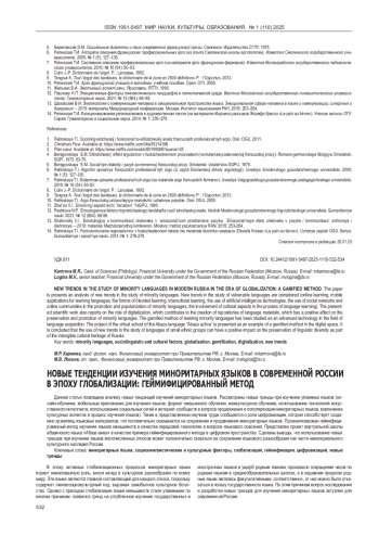 5. Кармова М.Р Социолингвистические параметры сохранения миноритарных языков. Мир науки, культуры, образования. 2024; № 1 (104): 444-446. EDN: BXZMVS