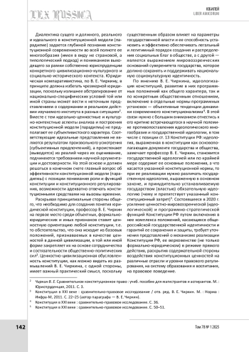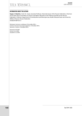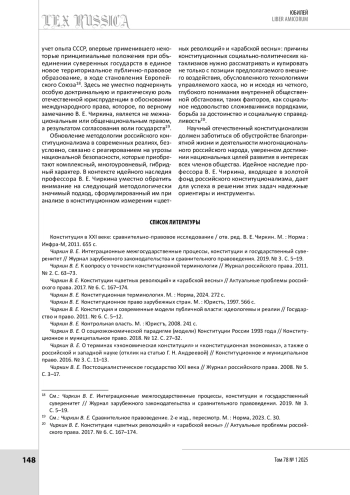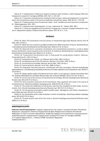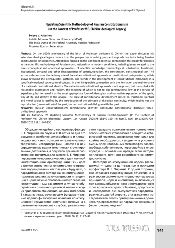 КАБЫШЕВ С. В. АКТУАЛИЗАЦИЯ НАУЧНОЙ МЕТОДОЛОГИИ РОССИЙСКОГО КОНСТИТУЦИОНАЛИЗМА (В КОНТЕКСТЕ ИДЕЙНОГО НАСЛЕДИЯ ПРОФЕССОРА В. Е. ЧИРКИНА) // LEX RUSSICA (РУССКИЙ ЗАКОН). 2025. ТОМ 78, № 1