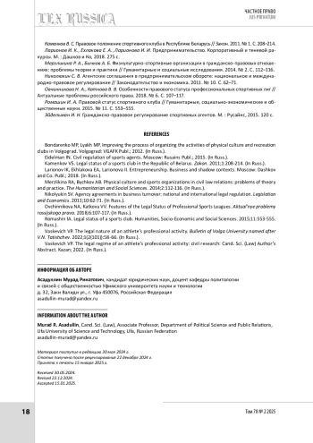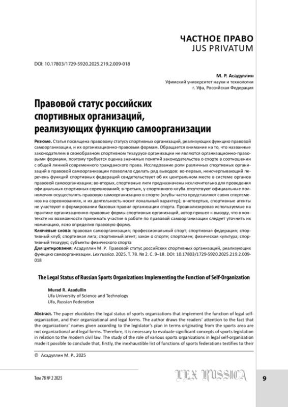 АСАДУЛЛИН М. Р. ПРАВОВОЙ СТАТУС РОССИЙСКИХ СПОРТИВНЫХ ОРГАНИЗАЦИЙ, РЕАЛИЗУЮЩИХ ФУНКЦИЮ САМООРГАНИЗАЦИИ // LEX RUSSICA (РУССКИЙ ЗАКОН). 2025. ТОМ 78, № 2