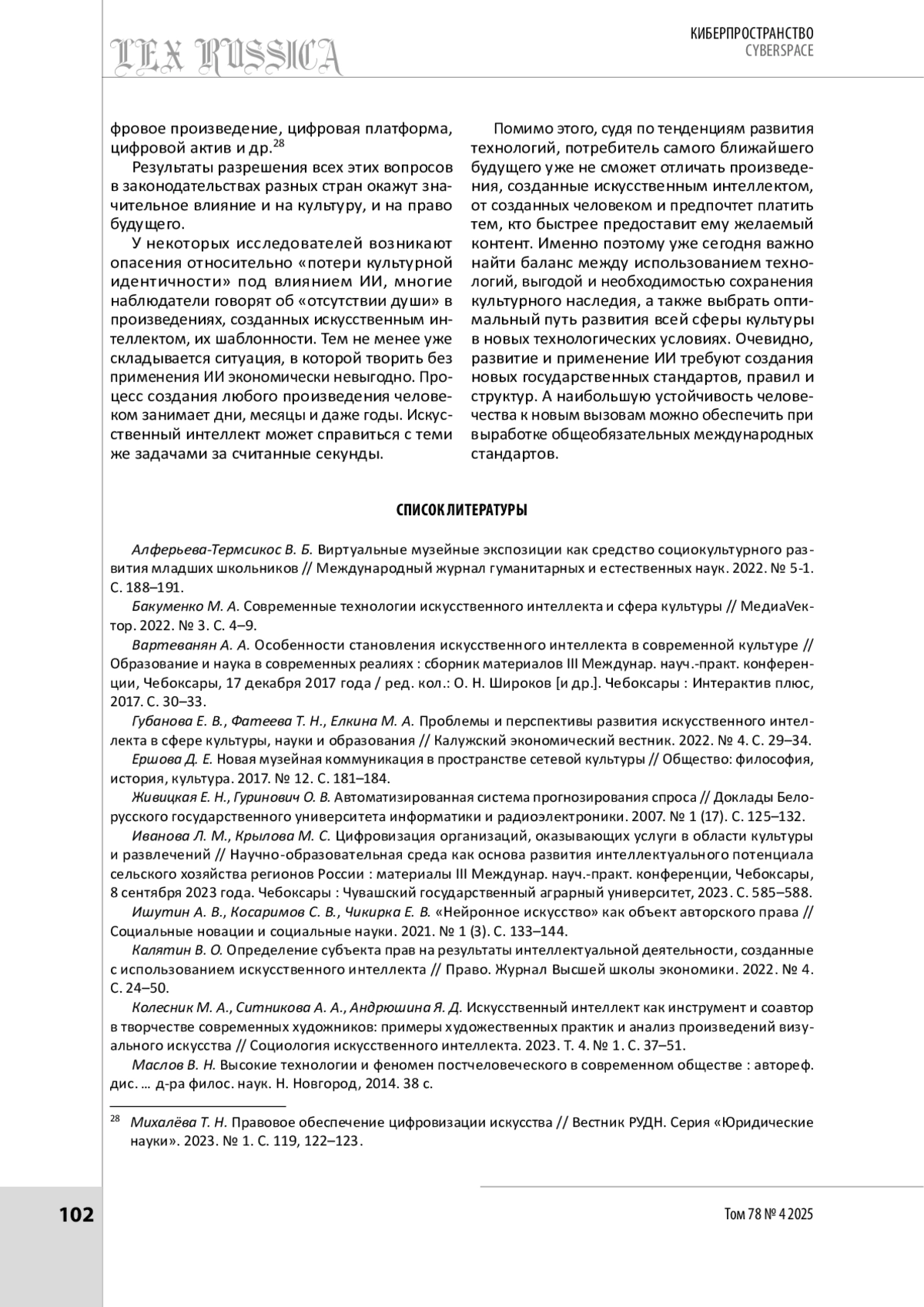 2. Бакуменко М. А. Современные технологии искусственного интеллекта и сфера культуры // МедиаVектор. 2022. № 3. С. 4-9.