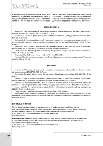 1. Аничкин Е. С. Объединение вузов и образовательная конкурентоспособность: вопросы взаимосвязи // Высшее образование в России. 2018. Т. 27. № 10. С. 9-19.