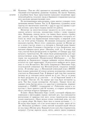 В статье рассматриваются особенности создания и деятельности дачно-потребительского поселка «Работников науки и искусства» («РАНИС») на Николиной Горе. Создававшийся как поселок-коммуна, он объединил творческую интеллигенцию 1920-1930-х годов, зачастую связанную дружескими или служебными отношениями. Здесь были реализованы принципы коллективизма: организация общественных огородов, выделение помещений для мелкого скотоводства, наличие общественного транспорта, создание кооперативной столовой и детских обучающих и досуговых мероприятий. Выступления артистов, музыкантов, писателей и ученых должны были объединять жителей поселка, формировать общие культурные представления. Мероприятия, проводимые здесь, стали своеобразным продолжением традиций литературы и искусства звенигородских мест, где бывали А. С. Пушкин, А. И. Герцен, А. П. Чехов, А. М. Горький, И. И. Левитан, К. С. Станиславский и др. Особое внимание в статье уделяется деятельности А. В. Чаянова, одного из трех создателей и вдохновителей дачного кооператива, привлекшего О. Ю. Шмидта, А. И. Кравченко, Б. А. Криля и др. на Николину Гору. Его раскопки в 1928-1929 годах Успенского городища на территории поселка носили не только научный (им предложена новая методика раскопок), но и образовательный характер, поскольку, кроме практических навыков, местные подростки получали и теоретические представления об истории земли, на которой были построены дачи. Феномен дачного кооператива на Николиной Горе является трансформацией усадебной традиции в реалиях XX века, где жизнь человека на лоне природы гармонично сочетается с интеллектуальной и творческой деятельностью.