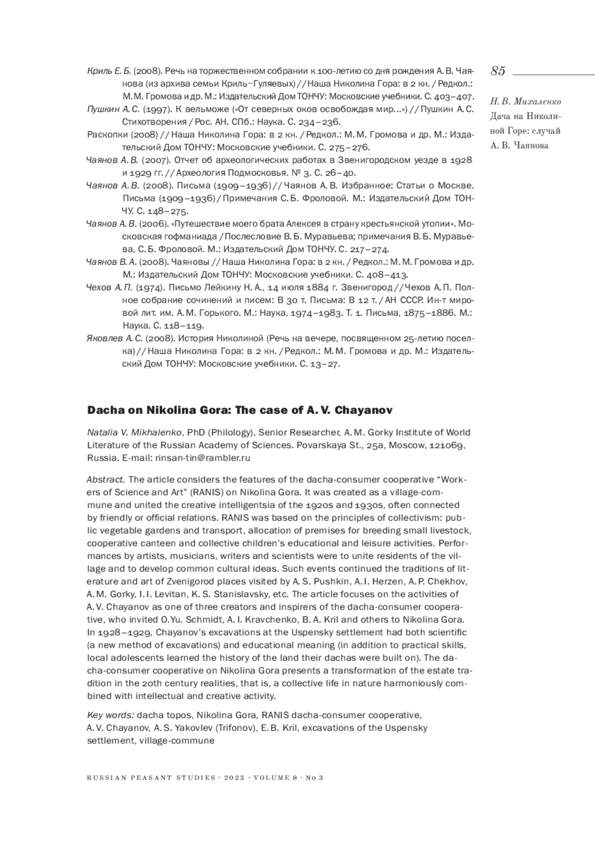 1. Кренке Н. А. (2007). Археологические работы А. В. Чаянова в долине Москвы-реки в 1928-1929 годах // Археология Подмосковья. Материалы научного семинара. Вып. 3. М.: ИА РАН. С. 23-25. EDN: GQJZJK