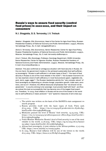 Статья: РОССИЙСКИЕ ПОДХОДЫ К ОБЕСПЕЧЕНИЮ ПРОДОВОЛЬСТВЕННОЙ БЕЗОПАСНОСТИ (СДЕРЖИВАНИЮ ЦЕН) В 2020-2022 ГОДЫ И ИХ ВЛИЯНИЕ НА ПОТРЕБИТЕЛЕЙ (2023)