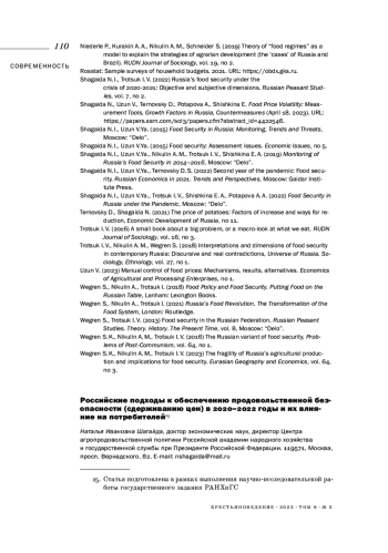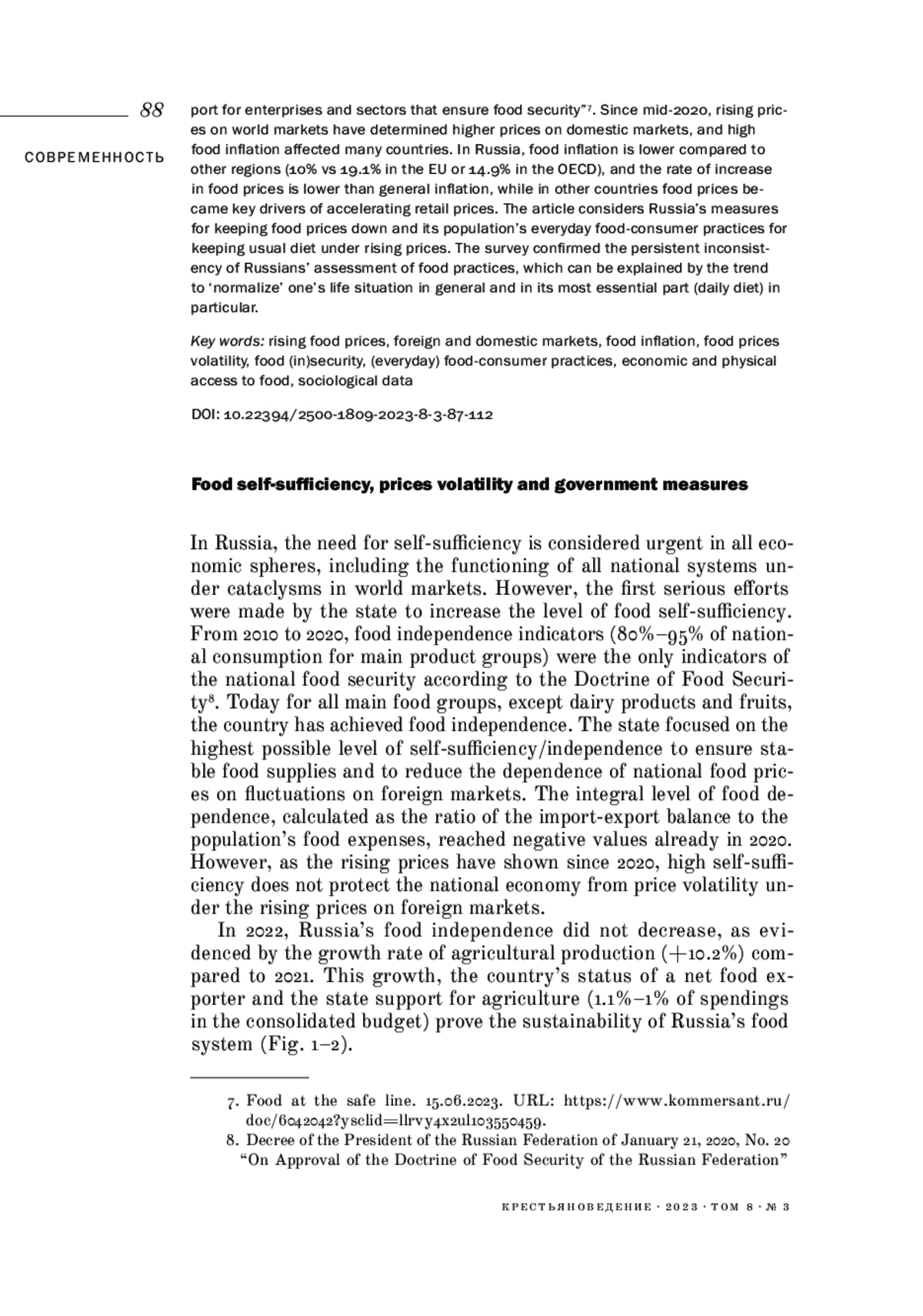 This year confirmed an ambiguous situation with food security in Russia. On the one hand, the government insists on the achieved sustainable food self-sufficiency/sovereignty: “Russia is self-sufficient in all basic types of food”2; “the level of food security in Russia is one of the most reliable in the world”3; “the Eurasian Economic Union has reached a level of self-sufficiency in most food products (grain, vegetable oils, pork, lamb, sugar, eggs)”4. The Russian leadership admits the “very complex nature” of food sovereignty as depending on climate change, population growth, trade wars, sanctions, and so on5. However, the official discourse emphasizes that “we should not be pessimists”, “a country striving to be sovereign must provide itself with food”, and Russia solves this task so successfully that has become one of the largest food exporters. Therefore, “in 2023, food inflation in Russia will be one of the lowest in the world due to self-sufficiency in basic products” 6 and “systemic measures of anti-crisis support for enterprises and sectors that ensure food security”7. Since mid-2020, rising prices on world markets have determined higher prices on domestic markets, and high food inflation affected many countries. In Russia, food inflation is lower compared to other regions (10% vs 19.1% in the EU or 14.9% in the OECD), and the rate of increase in food prices is lower than general inflation, while in other countries food prices became key drivers of accelerating retail prices. The article considers Russia’s measures for keeping food prices down and its population’s everyday food-consumer practices for keeping usual diet under rising prices. The survey confirmed the persistent inconsistency of Russians’ assessment of food practices, which can be explained by the trend to ‘normalize’ one’s life situation in general and in its most essential part (daily diet) in particular.