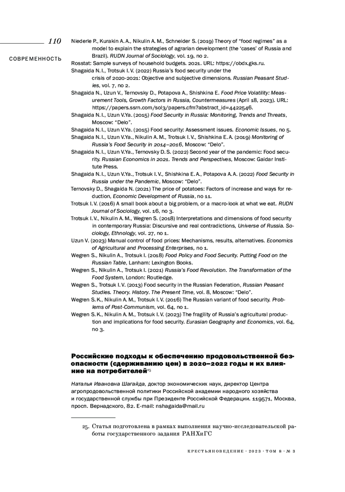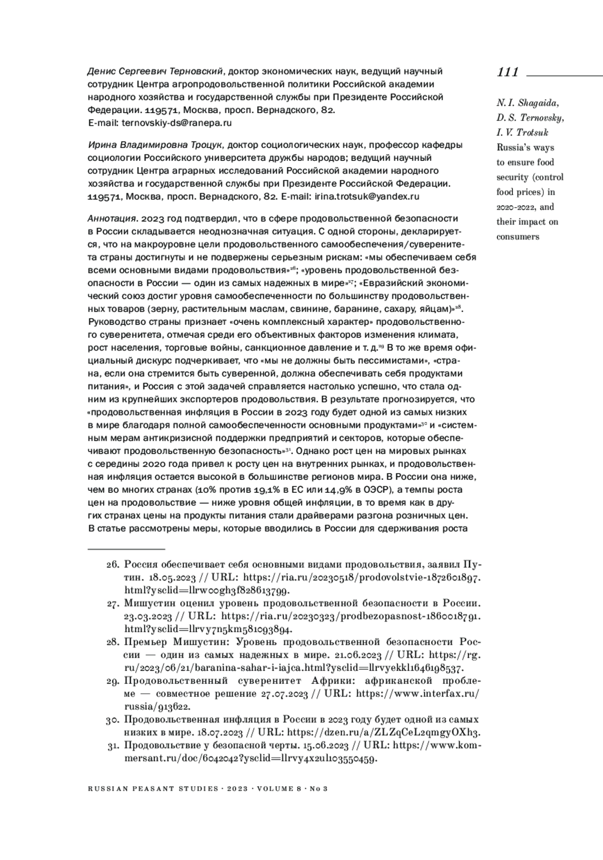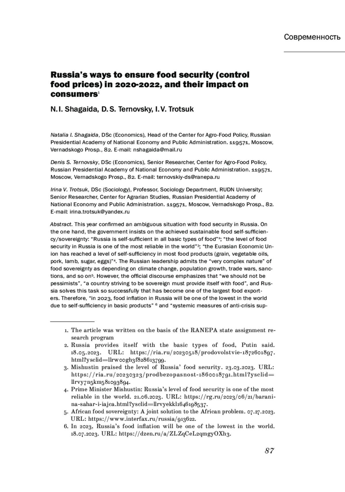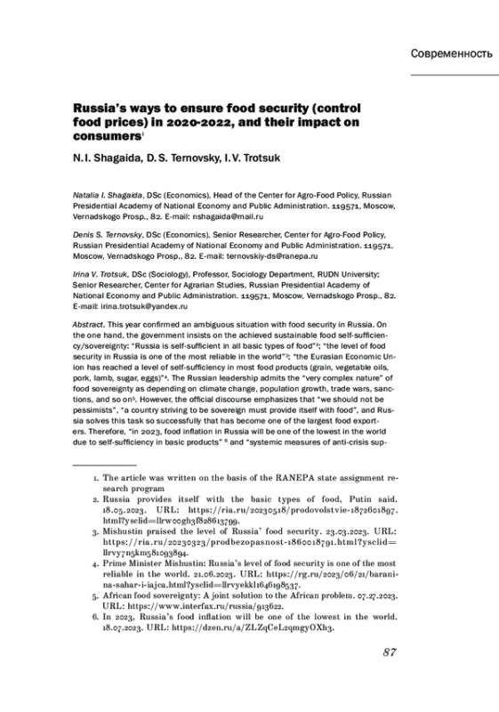 ШАГАЙДА Н. И., ТЕРНОВСКИЙ Д. С., ТРОЦУК И. В. РОССИЙСКИЕ ПОДХОДЫ К ОБЕСПЕЧЕНИЮ ПРОДОВОЛЬСТВЕННОЙ БЕЗОПАСНОСТИ (СДЕРЖИВАНИЮ ЦЕН) В 2020-2022 ГОДЫ И ИХ ВЛИЯНИЕ НА ПОТРЕБИТЕЛЕЙ // КРЕСТЬЯНОВЕДЕНИЕ. 2023. Т. 8 № 3