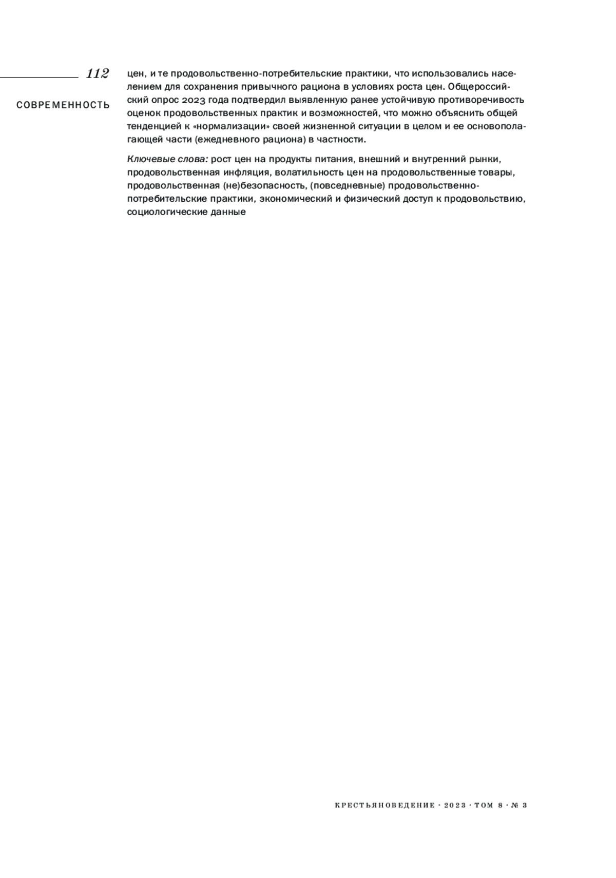 Ключевые фразы: рост цен на продукты питания, внешний и внутренний рынки, продовольственная инфляция, волатильность цен на продовольственные товары, продовольственная (не)безопасность, (повседневные) продовольственно-потребительские практики, экономический и физический доступ к продовольствию, социологические данные