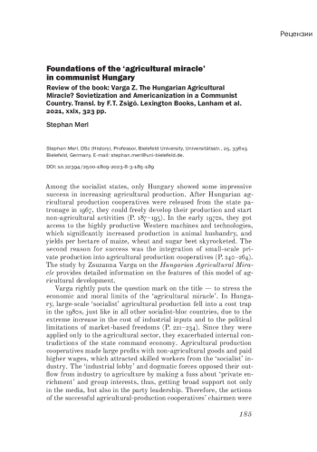 Review of the book: Varga Z. The Hungarian Agricultural Miracle? Sovietization and Americanization in a Communist Country. Transl. by F. T. Zsigó. Lexington Books, Lanham et al. 2021, xxix, 323 pp.