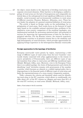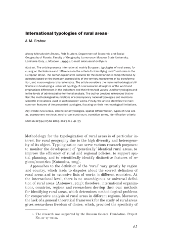 The article presents international, mainly European, typologies of rural areas, focusing on the features and differences in the criteria for identifying ‘rural’ territories in the European Union. The author explains the reasons for the need for more comprehensive typologies based on the transport accessibility of the territory, trajectories of its transformation, and macro-regional characteristics. The article considers the main methodological difficulties in developing a universal typology of rural areas for all regions of the world and emphasizes differences in the indicators and their threshold values used for typologies and in the levels of administrative-territorial analysis. The author provides references that reflect the methodological foundations of contemporary national typologies and mentions scientific innovations used in such research works. Finally, the article identifies the main common features of the presented typologies, focusing on their methodological limitations.