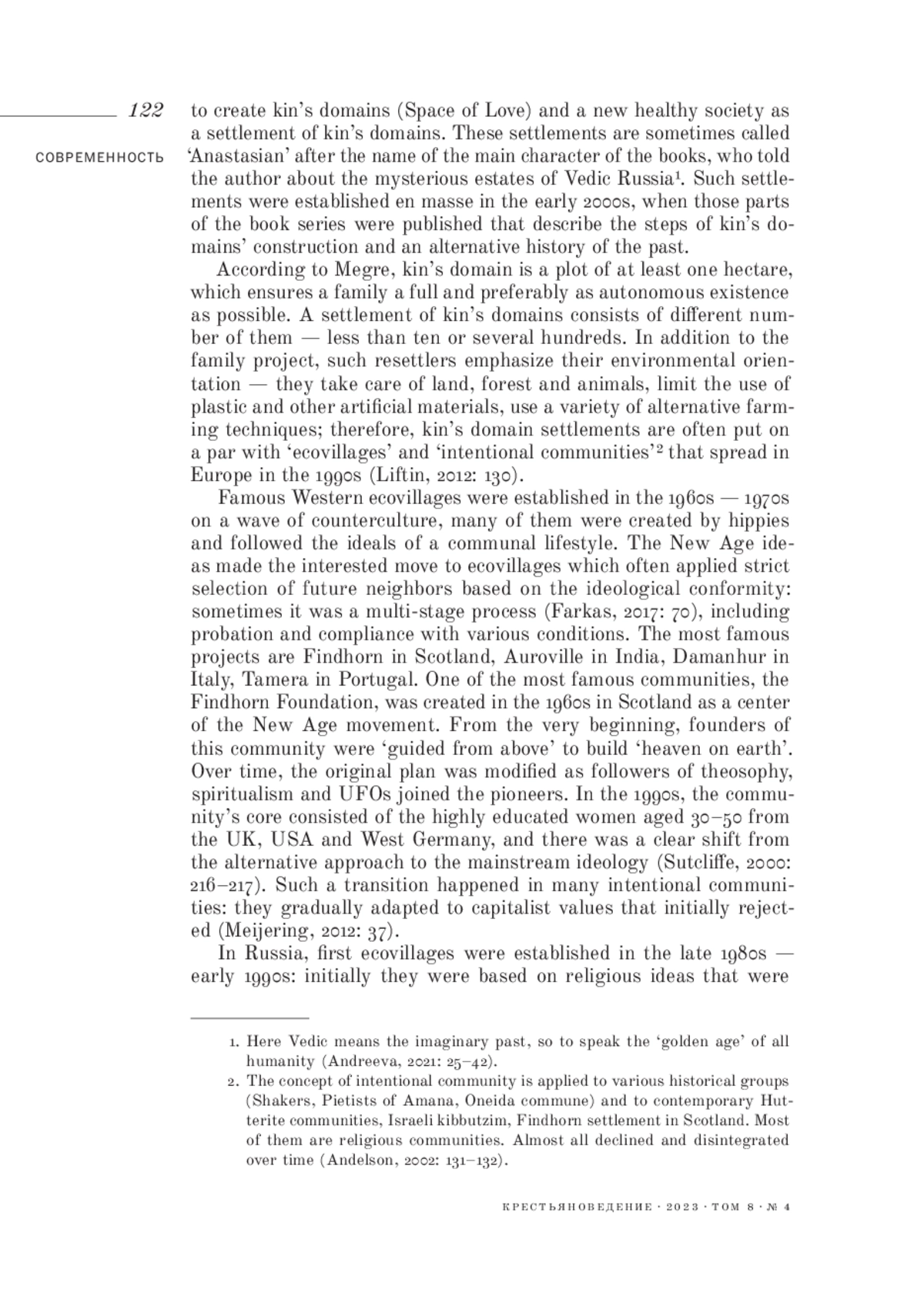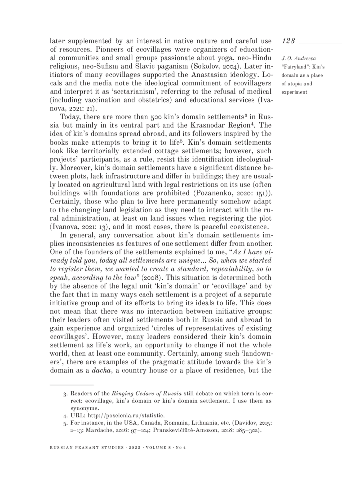 3. Andreeva J. (2021) Traditions and the imagined past in the Russian Anastasian intentional communities. Journal of Ethnology and Folkloristics, vol. 15, no 2, pp. 25-42. EDN: JWCVYR