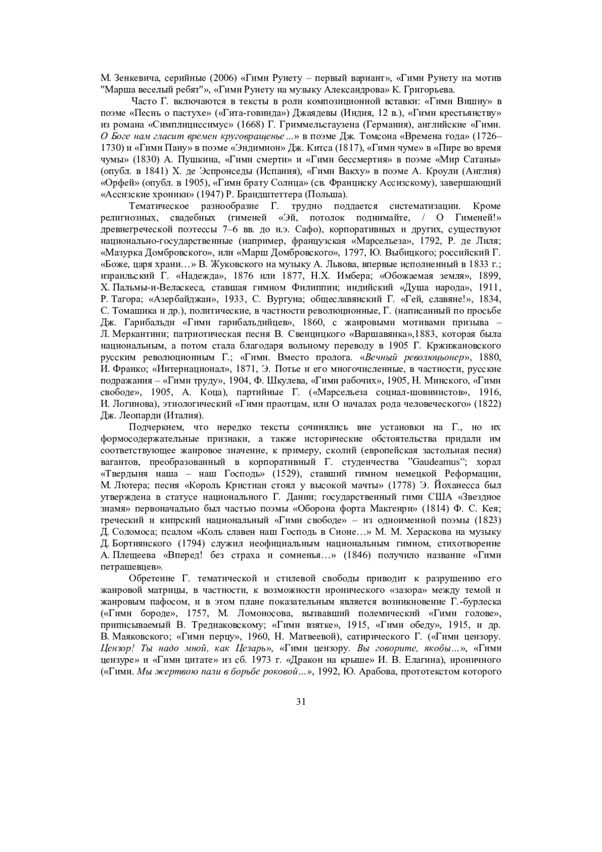 Статья обобщает наиболее существенные жанрологические знания о гимне. В ней перечислены архаические образцы жанра разных регионов и стран, подробно изложена античная гимнографии в основных тенденциях и персоналиях. Подчеркнута преемственность европейской гимнической традиции - античной. Определены источники европейского религиозного гимна и прослежена его история, упомянуты известные творцы литургической поэзии, представленной различными модификациями гимна. На широком стихотворном материале исследован светский гимн в его тематическом, стилевом и функциональном многообразии. Отмечены факты циклизации гимна и его композиционное участие в художественном произведении.