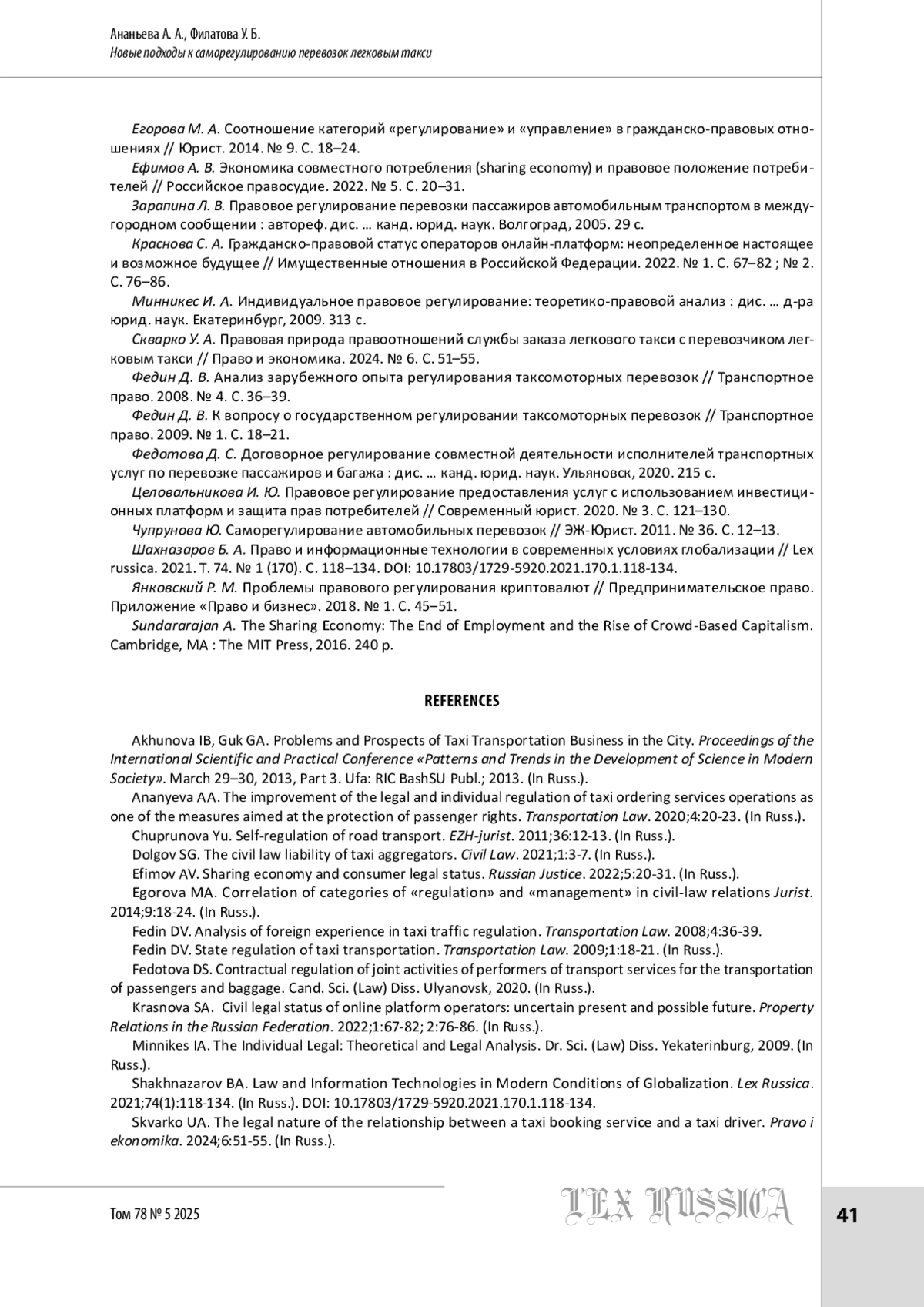 1. Ананьева А. А. Совершенствование правового и индивидуального договорного регулирования работы сервисов заказа услуг такси как одна из мер, направленных на защиту прав пассажиров // Транспортное право. 2020. № 4. С. 20-23.