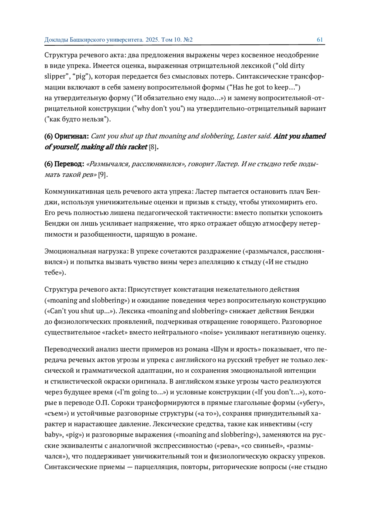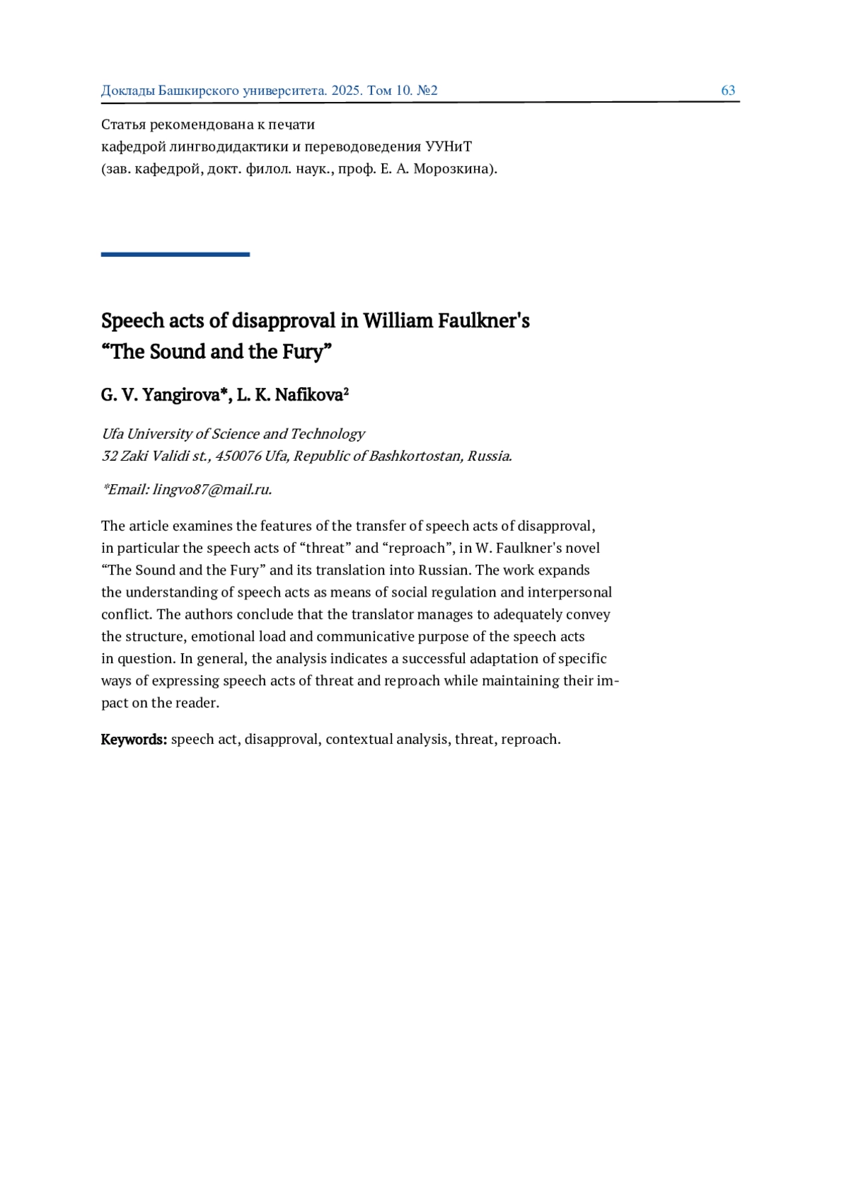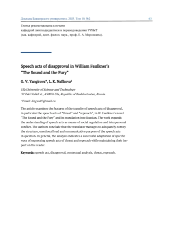 Статья исследует особенности передачи речевых актов неодобрения, в частности речевых актов «угроза» и «упрек», в романе У. Фолкнера «Шум и ярость» и его переводе на русский язык. Работа расширяет понимание речевых актов как средств социального регулирования и межличностного конфликта. Авторы приходят к выводу, что переводчику удается адекватно передать структуру, эмоциональную нагрузку и коммуникативную цель рассматриваемых речевых актов. В целом анализ свидетельствует об успешной адаптации специфических способов выражения речевых актов угрозы и упрека с сохранением их воздействия на читателя.