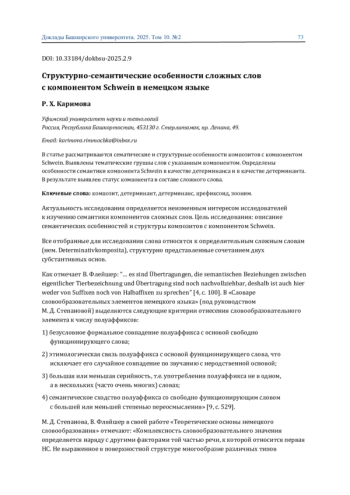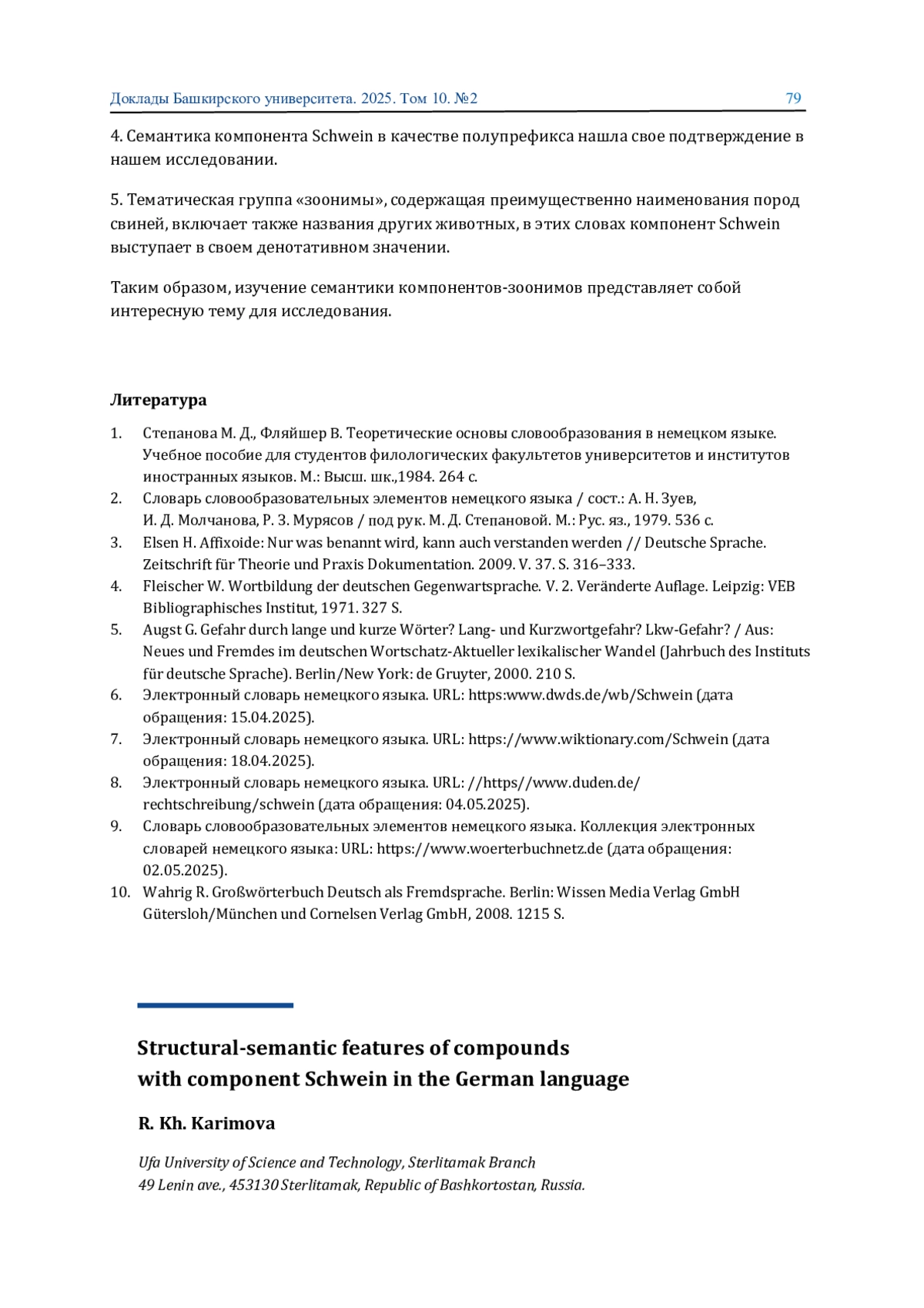 КАРИМОВА Р. Х. СТРУКТУРНО-СЕМАНТИЧЕСКИЕ ОСОБЕННОСТИ СЛОЖНЫХ СЛОВ С КОМПОНЕНТОМ SCHWEIN В НЕМЕЦКОМ ЯЗЫКЕ // ДОКЛАДЫ БАШКИРСКОГО УНИВЕРСИТЕТА. 2025. Т. 10 № 2