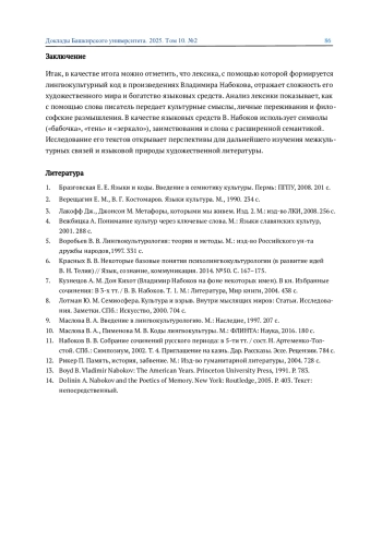 Творчество Владимира Набокова занимает уникальное место в мировой литературе, и оно привлекает внимание исследователей благодаря синтезу языковой игры, культурных аллюзий и богатства лексических средств [1]. Лингвокультурный код его произведений представляет собой сложный сплав литературных, национальных и языковых пластов, который служит ключом к интерпретации авторского замысла.