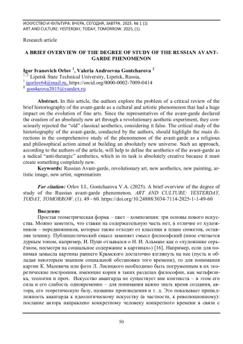 В данной статье авторы исследуют проблему критического обзора краткой историографии авангарда как культурно-художественного феномена, оказавшего огромное влияние на эволюцию изобразительного искусства. Поскольку представители авангарда заявили фактически создание абсолютно нового искусства путем революционно-эстетического эксперимента, то они осознанно отвергали «старую» классическую эстетику, считая ее ложной. Критическое исследование историографии авангарда, проводимое авторами, должно выделить основные направления в комплексном исследовании феномена авангарда как религиозно-философского действия, направленного на построение абсолютно нового мироздания. Такой подход, согласно мнению авторов статьи, поможет определить эстетику авангарда как радикальную «анти-теургическую» эстетику, которая по своей задаче является абсолютно творческой, в первую очередь потому, что должна создать нечто совершенно новое.