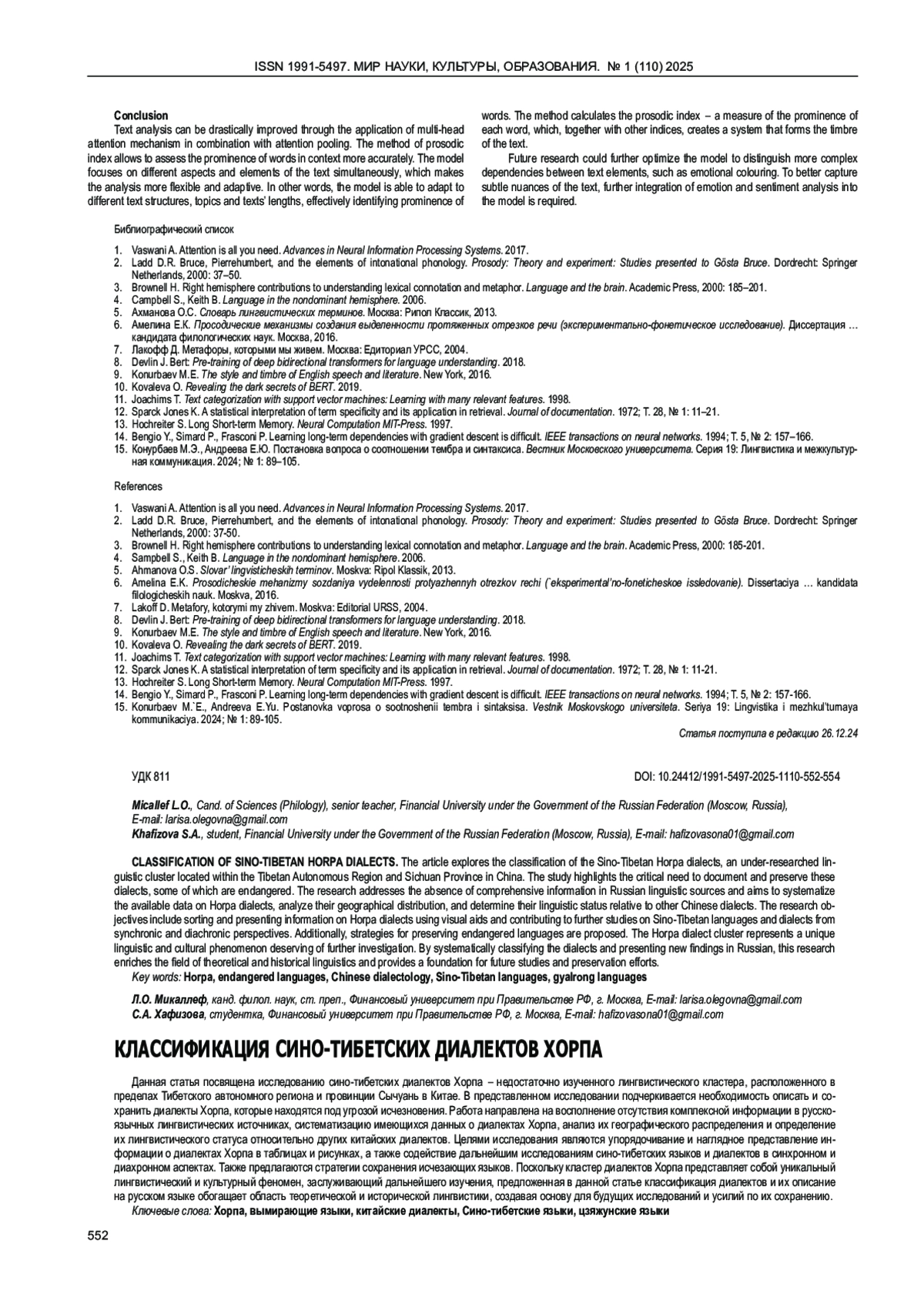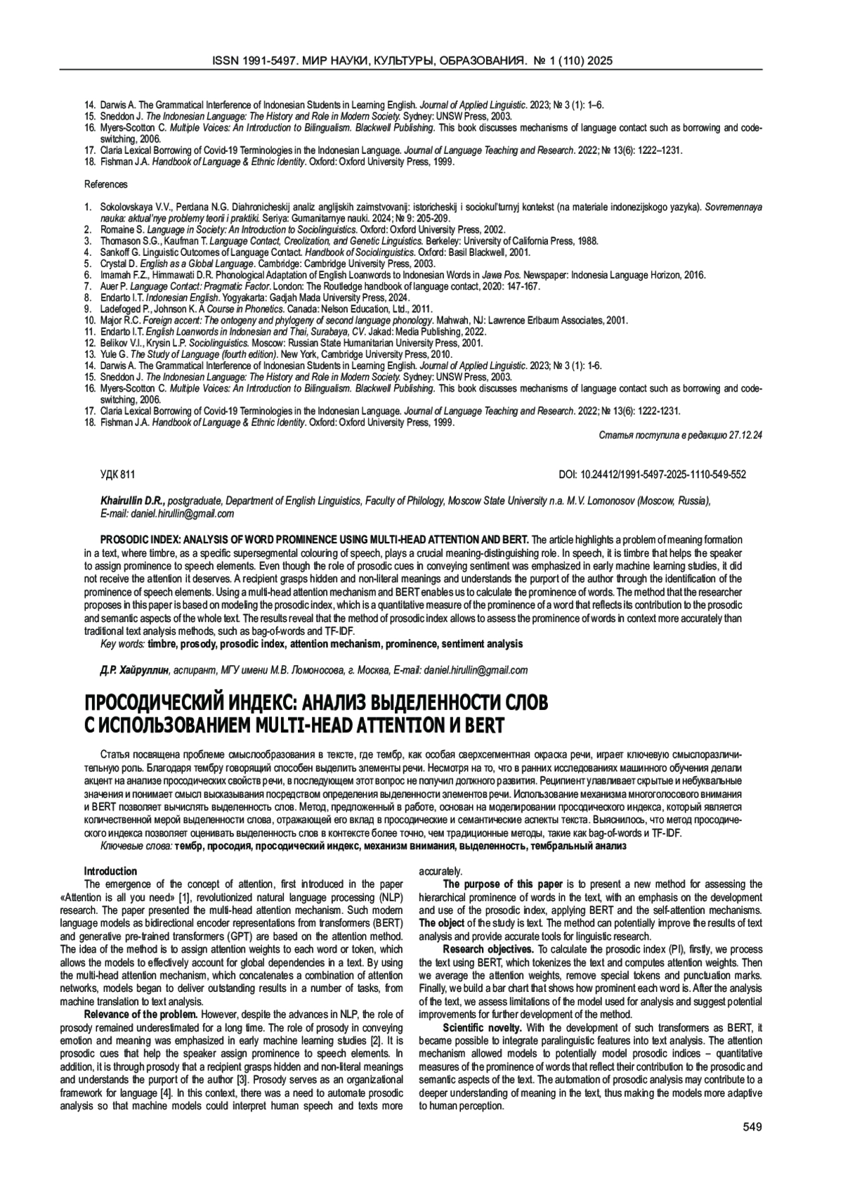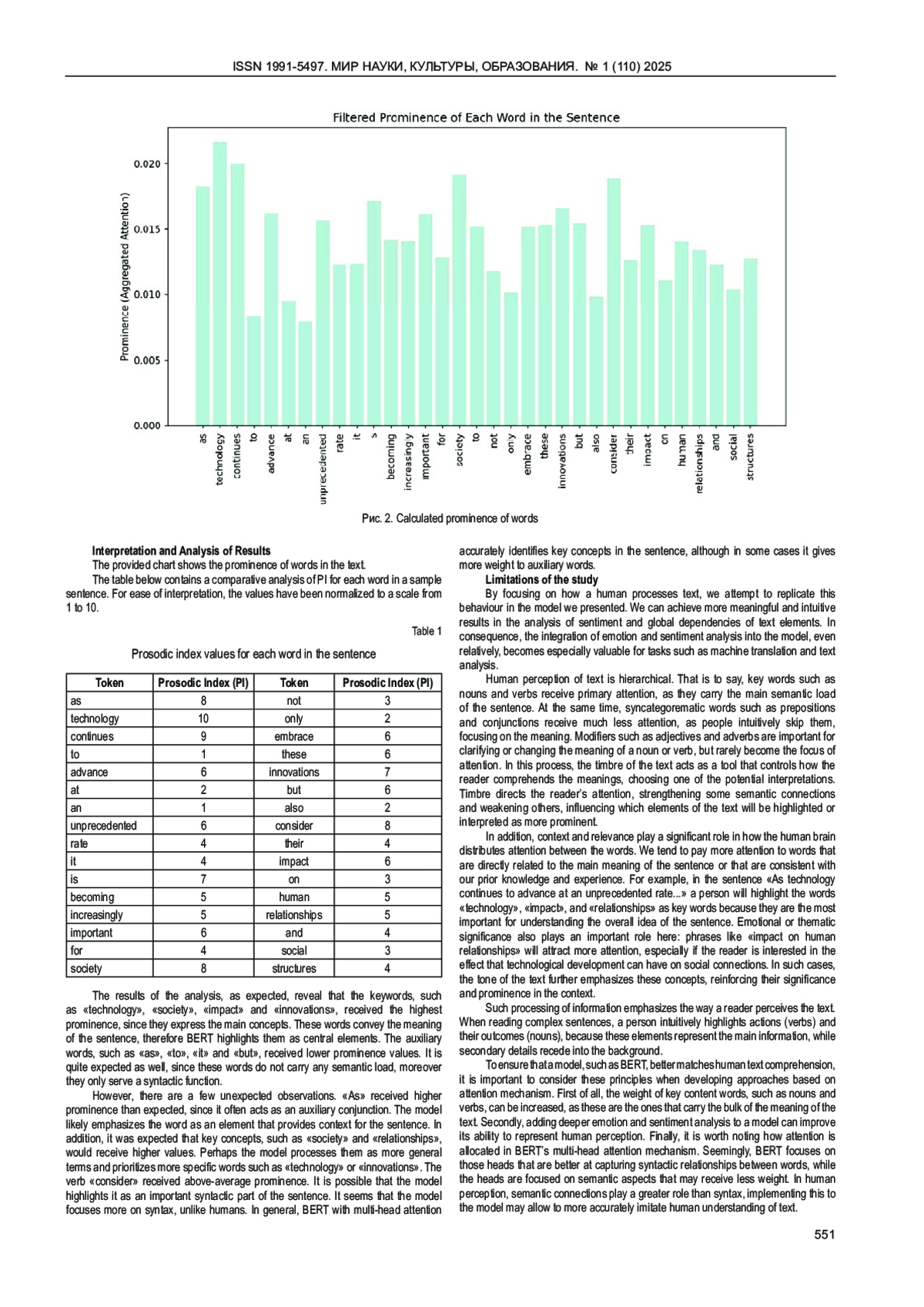 ХАЙРУЛЛИН Д. Р. ПРОСОДИЧЕСКИЙ ИНДЕКС: АНАЛИЗ ВЫДЕЛЕННОСТИ СЛОВ С ИСПОЛЬЗОВАНИЕМ MULTI-HEAD ATTENTION И BERT // МИР НАУКИ, КУЛЬТУРЫ, ОБРАЗОВАНИЯ. 2025. № 1 (110)