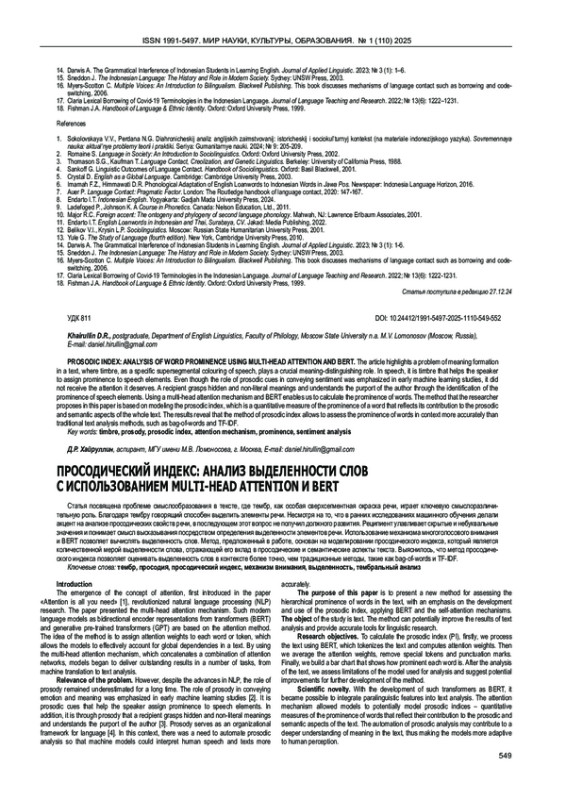 Статья: ПРОСОДИЧЕСКИЙ ИНДЕКС: АНАЛИЗ ВЫДЕЛЕННОСТИ СЛОВ С ИСПОЛЬЗОВАНИЕМ MULTI-HEAD ATTENTION И BERT (2025)