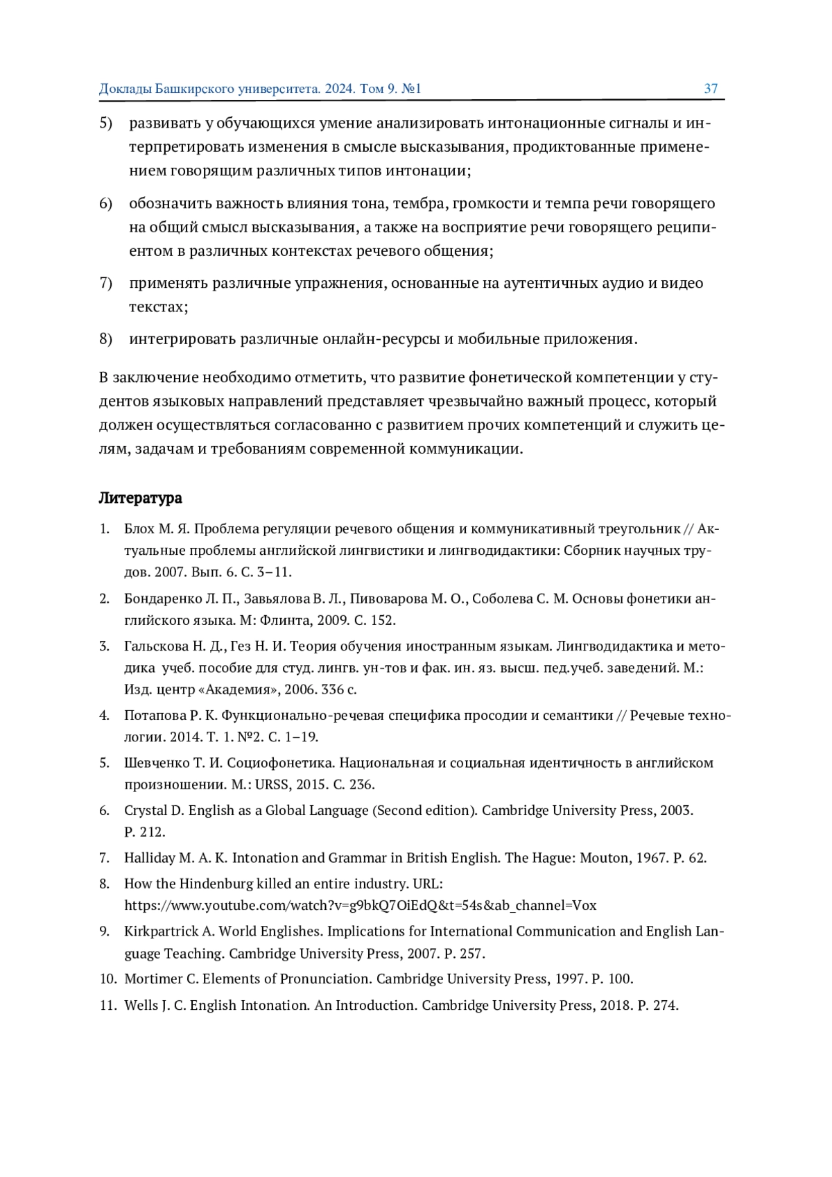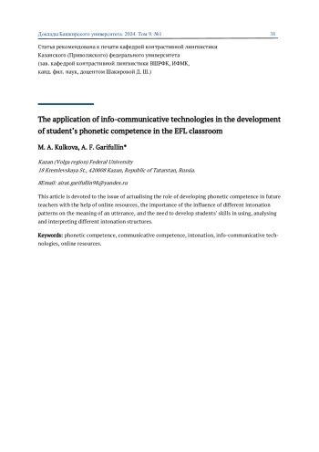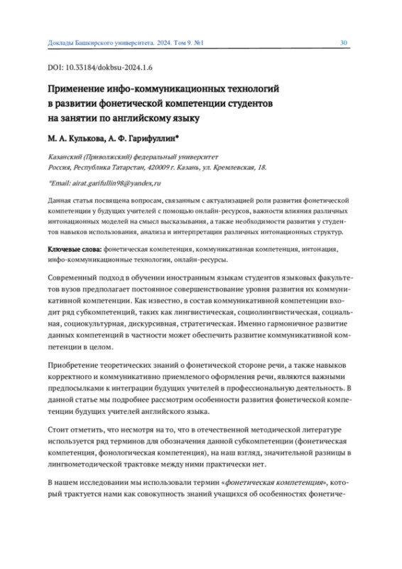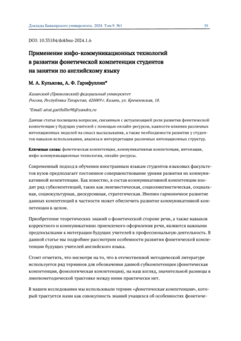 КУЛЬКОВА М. А., ГАРИФУЛЛИН А. Ф. ПРИМЕНЕНИЕ ИНФО-КОММУНИКАЦИОННЫХ ТЕХНОЛОГИЙ В РАЗВИТИИ ФОНЕТИЧЕСКОЙ КОМПЕТЕНЦИИ СТУДЕНТОВ НА ЗАНЯТИИ ПО АНГЛИЙСКОМУ ЯЗЫКУ // ДОКЛАДЫ БАШКИРСКОГО УНИВЕРСИТЕТА. 2024. Т. 9 № 1