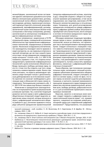 1. Богданов Д. Е. Несостоявшаяся технологическая революция в договорном праве: апологетика традиционалистской трактовки договора // Lex russica. 2023. Т. 76. № 3. С. 21-40.