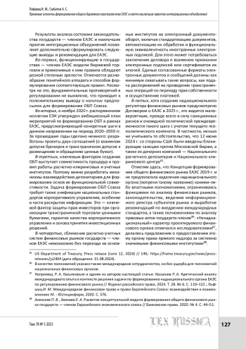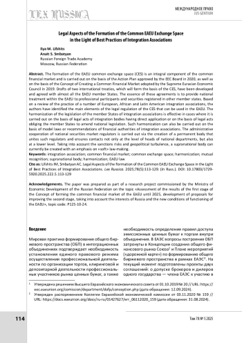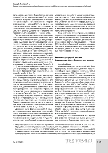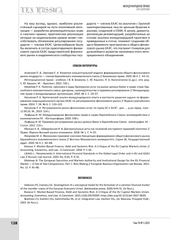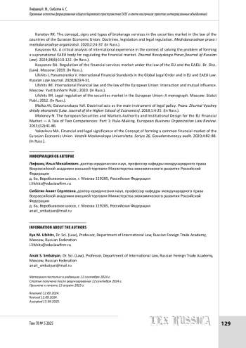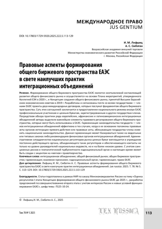 ЛИФШИЦ И. М., СМБАТЯН А. С. ПРАВОВЫЕ АСПЕКТЫ ФОРМИРОВАНИЯ ОБЩЕГО БИРЖЕВОГО ПРОСТРАНСТВА ЕАЭС В СВЕТЕ НАИЛУЧШИХ ПРАКТИК ИНТЕГРАЦИОННЫХ ОБЪЕДИНЕНИЙ // LEX RUSSICA (РУССКИЙ ЗАКОН). 2025. ТОМ 78, № 5