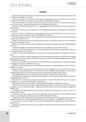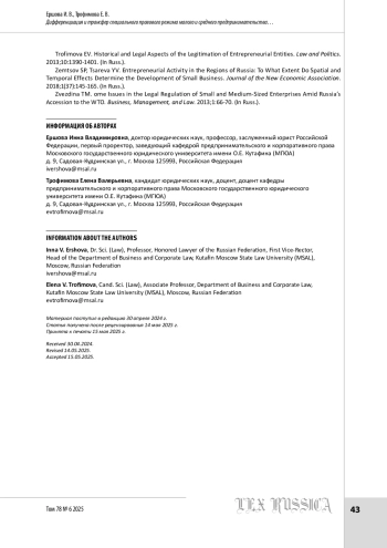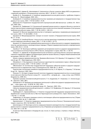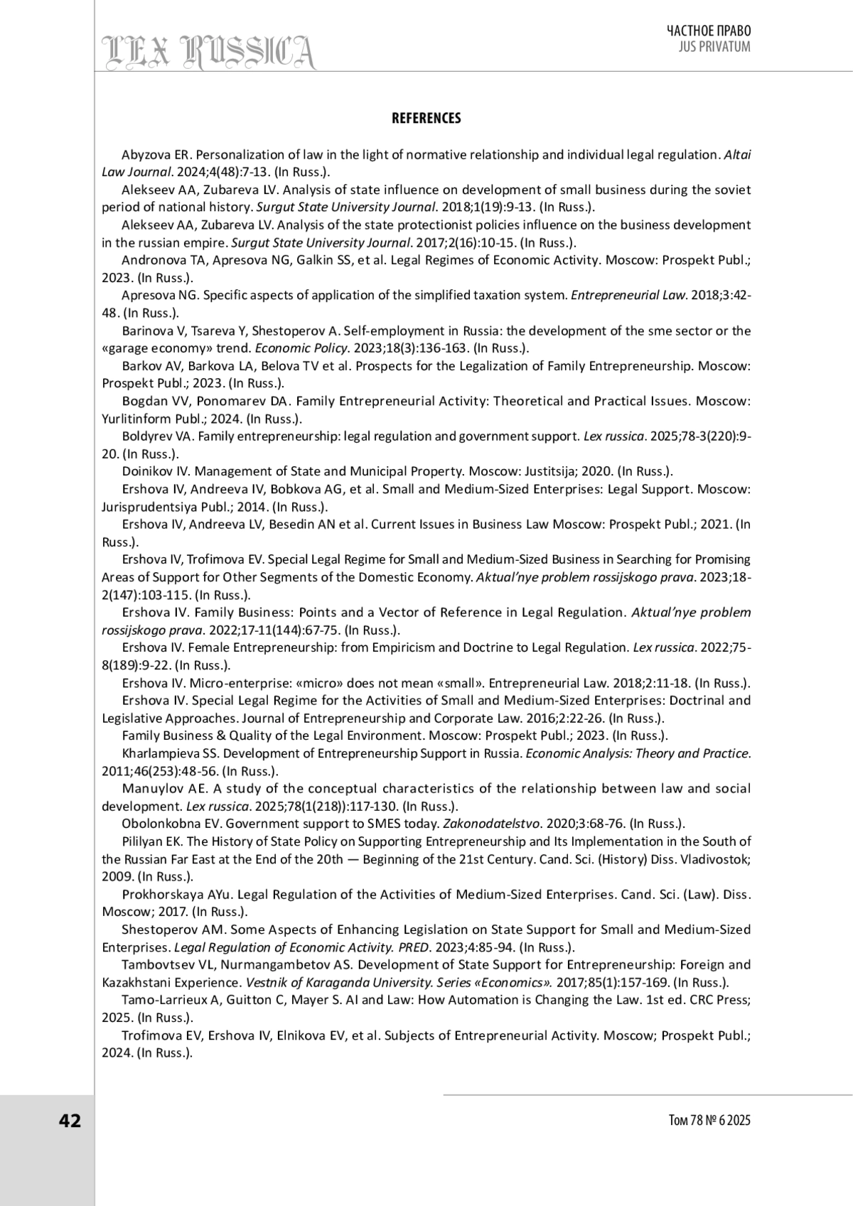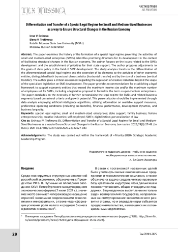 ЕРШОВА И. В., ТРОФИМОВА Е. В. ДИФФЕРЕНЦИАЦИЯ И ТРАНСФЕР СПЕЦИАЛЬНОГО ПРАВОВОГО РЕЖИМА МАЛОГО И СРЕДНЕГО ПРЕДПРИНИМАТЕЛЬСТВА КАК СПОСОБ ОБЕСПЕЧЕНИЯ СТРУКТУРНЫХ ИЗМЕНЕНИЙ РОССИЙСКОЙ ЭКОНОМИКИ // LEX RUSSICA (РУССКИЙ ЗАКОН). 2025. ТОМ 78, № 6