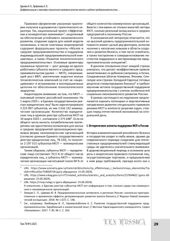 Статья: Дифференциация и трансфер специального правового режима малого и среднего предпринимательства как способ обеспечения структурных изменений российской экономики (2025)