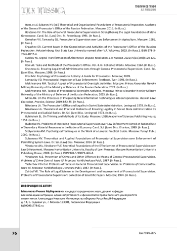 13. Махьянова Р. М. Тактический аспект надзорной деятельности органов прокуратуры : монография. М. : Военный университет имени князя Александра Невского Минобороны России, 2022. 170 с.