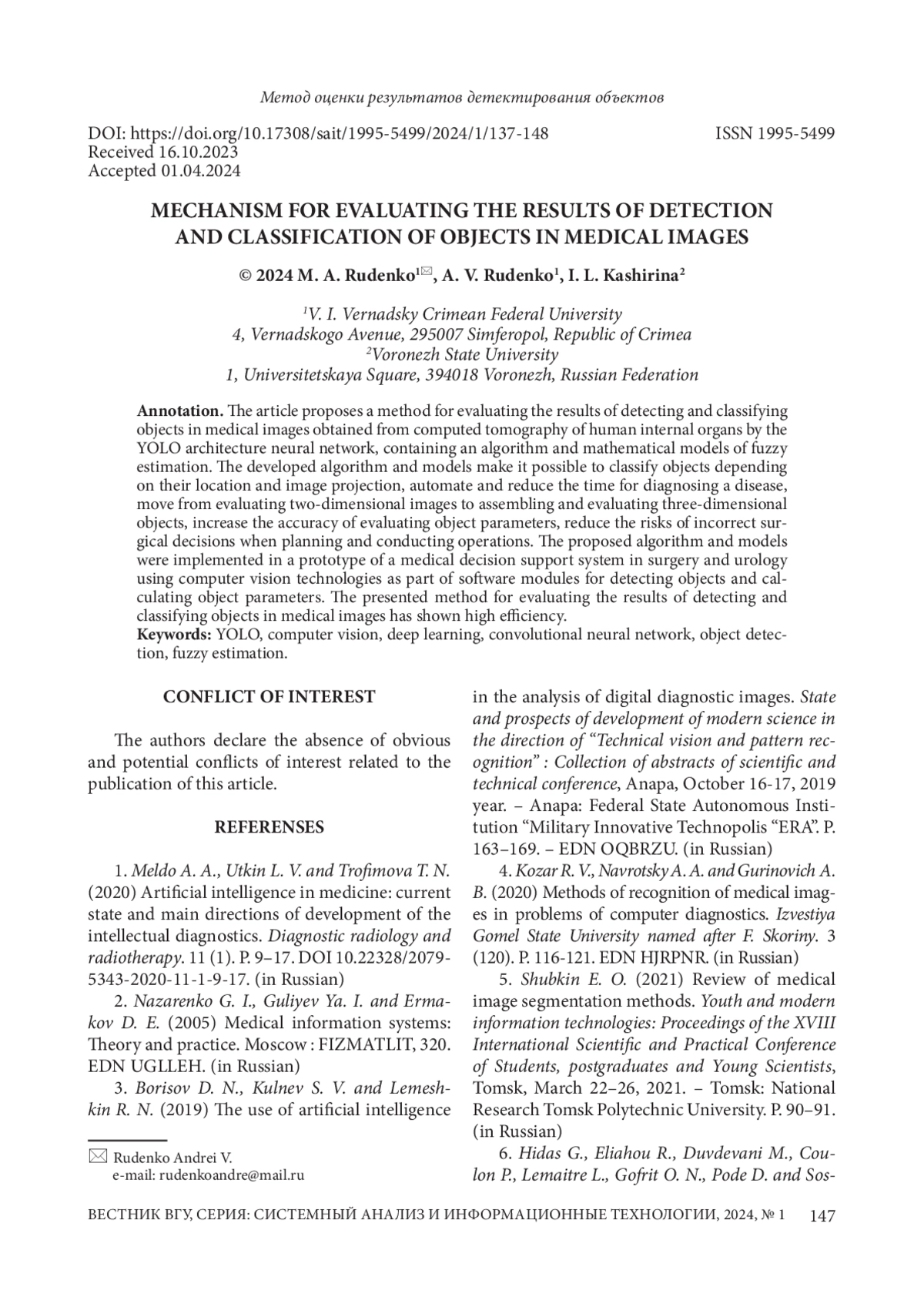 14. Система детектирования и анализа объектов на КТ-снимках в урологии / М. А. Руденко, А. В. Руденко, М. А. Крапивина, В. С. Лисовский // III Международная конференция по нейронным сетям и нейротехнологиям (NEURONT’2022): сборник докладов, Санкт-Петербург, 16 июня 2022 г. -Санкт-Петербург: Санкт-Петербургский государственный электротехнический университет “ЛЭТИ” им. В. И. Ульянова (Ленина), 2022. - С. 38-42. EDN: LXCNGO