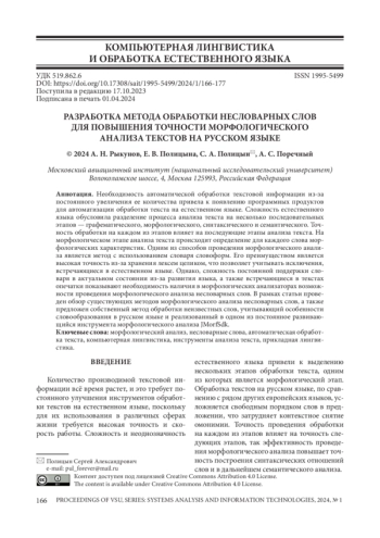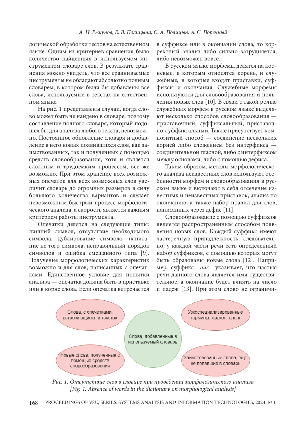 8. Рыкунов А. Н. Исследование инструментов морфологического анализа текстов на русском языке для повышения точности алгоритмов обработки в библиотеке JMorfSdk / А. Н. Рыкунов, E. В. Полицына, С. А. Поли-цын, А. С. Поречный // Информатика: проблемы, методы, технологии. - 2022. - С. 12041212. EDN: QKISHK